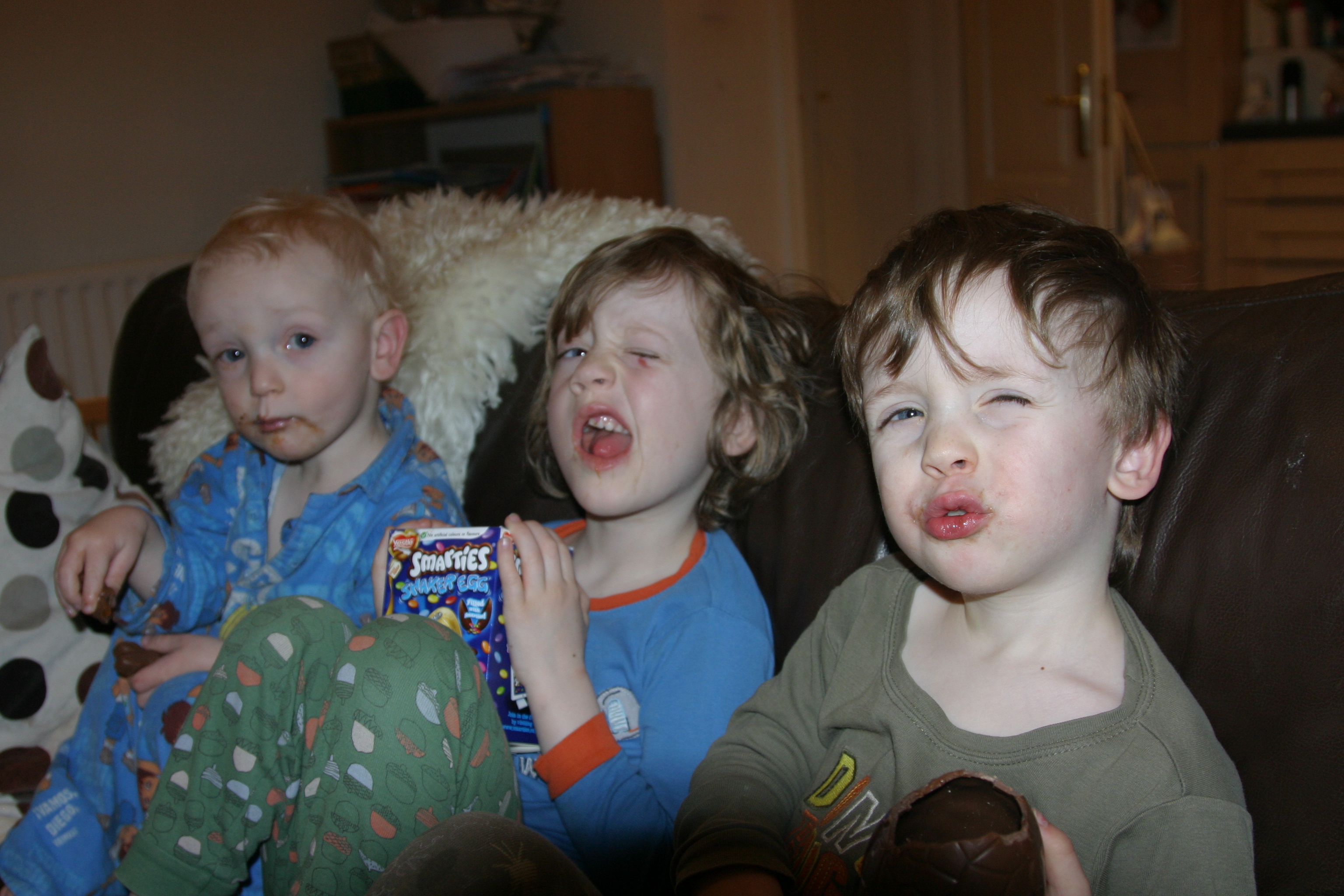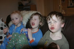 Here is a photo of Custard, Barnaby and Noah overdosing on bad Cadbury’s eggs. None of that crap for Mark and I though; oh no! We have had the lovely organic Green & Black’s eggs. Nothing but the best for mom and pop.