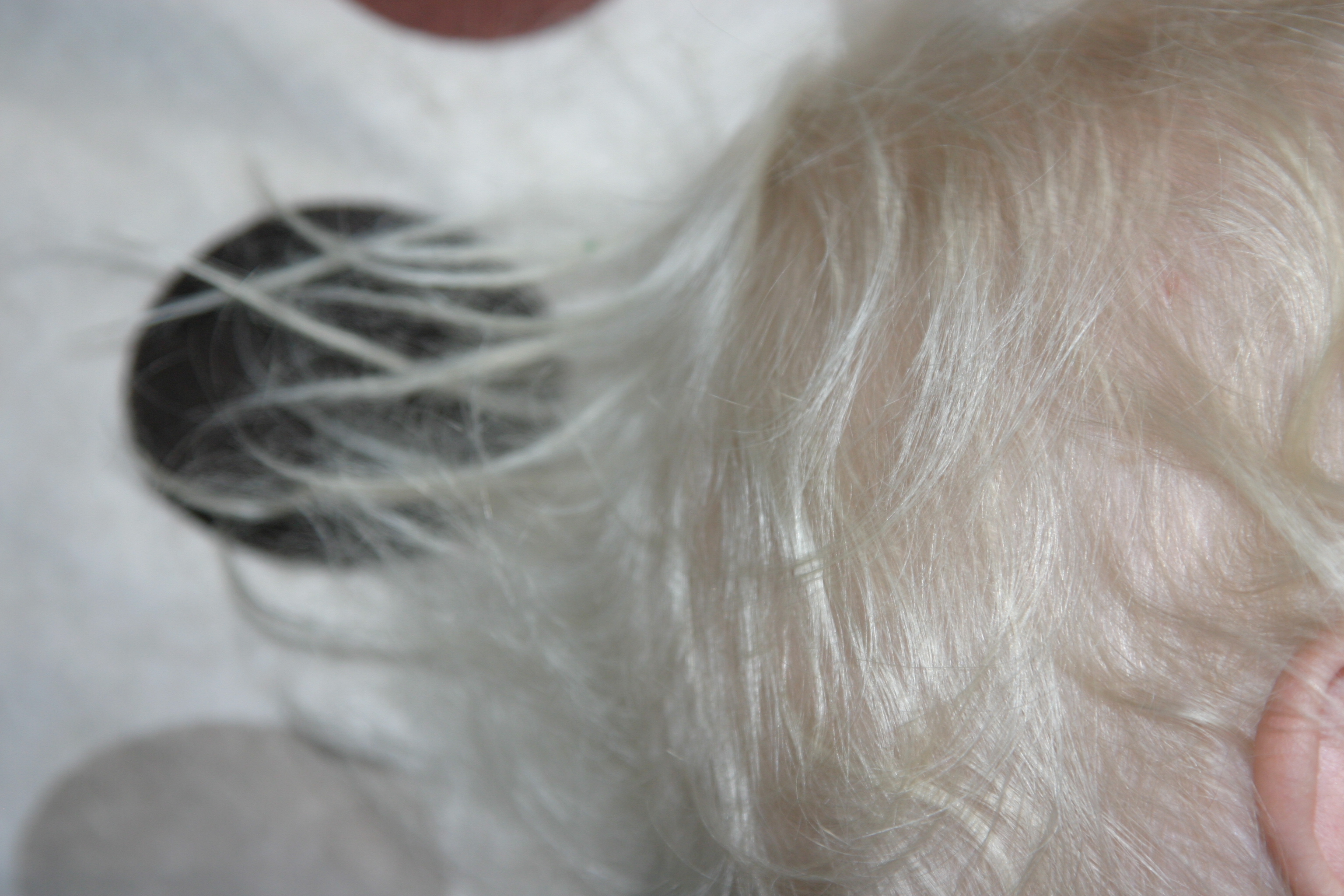 Meanwhile, Custard has developed dags in his hair, a bit like Barbie used to when you did not look after her properly. Well, I never had a Barbie with dags, because I was the baby of the family with lots of toys that I did not have to share and so I choose to hoard my stuff, keeping it all pristine and silken and boxed and unsullied. Which means, I suppose, that I have a better track record with my Barbies than with my own children, and it may well be that my childhood OCD requires further investigation. Ah well. Here are the dags: