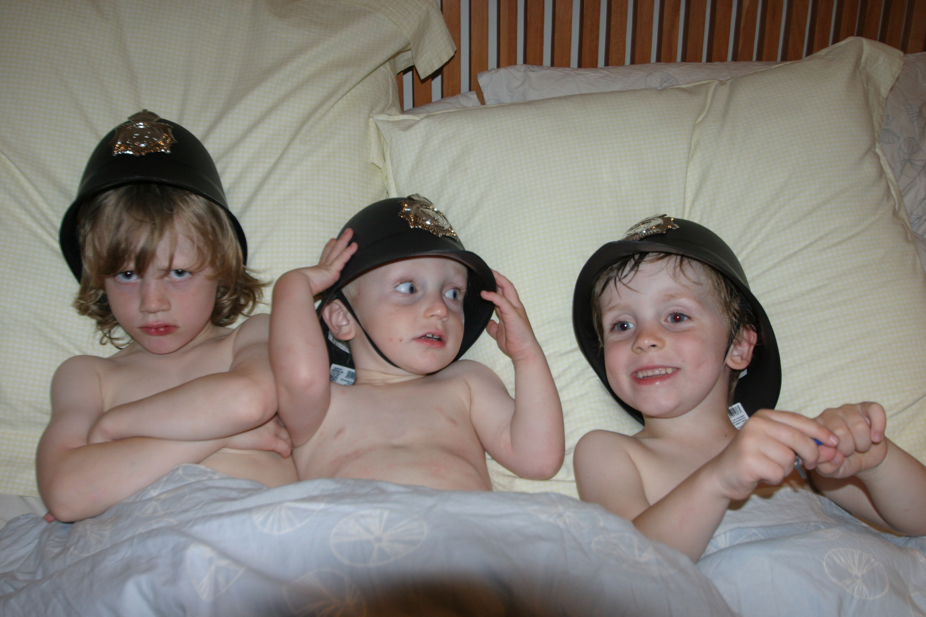 Then we scoffed pancakes at Harlem (a little breakfast cocktail for me first, ahem) then bought policeman hats from the tourist shops along Queensway enroute to the pirate park. Then we had ice creams. It was lovely. Here are the boys after their bath in their hats, looking a little bit odd: Note the extremely cranky kid on the left. Not best pleased by the cosy photo op.