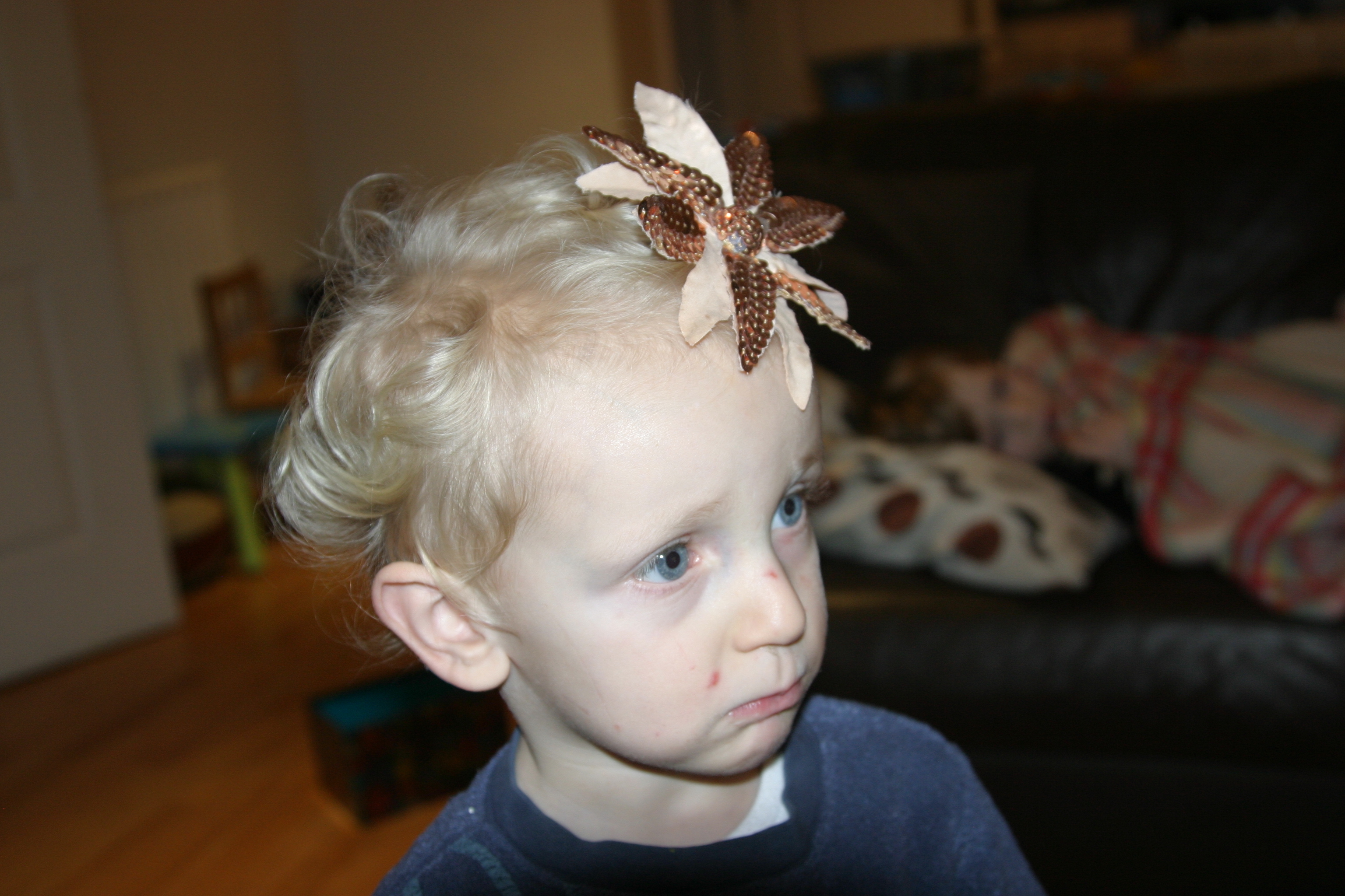 Apropos of nothing, here is a forlorn Custard in a sequinned fabric flower hairclip: