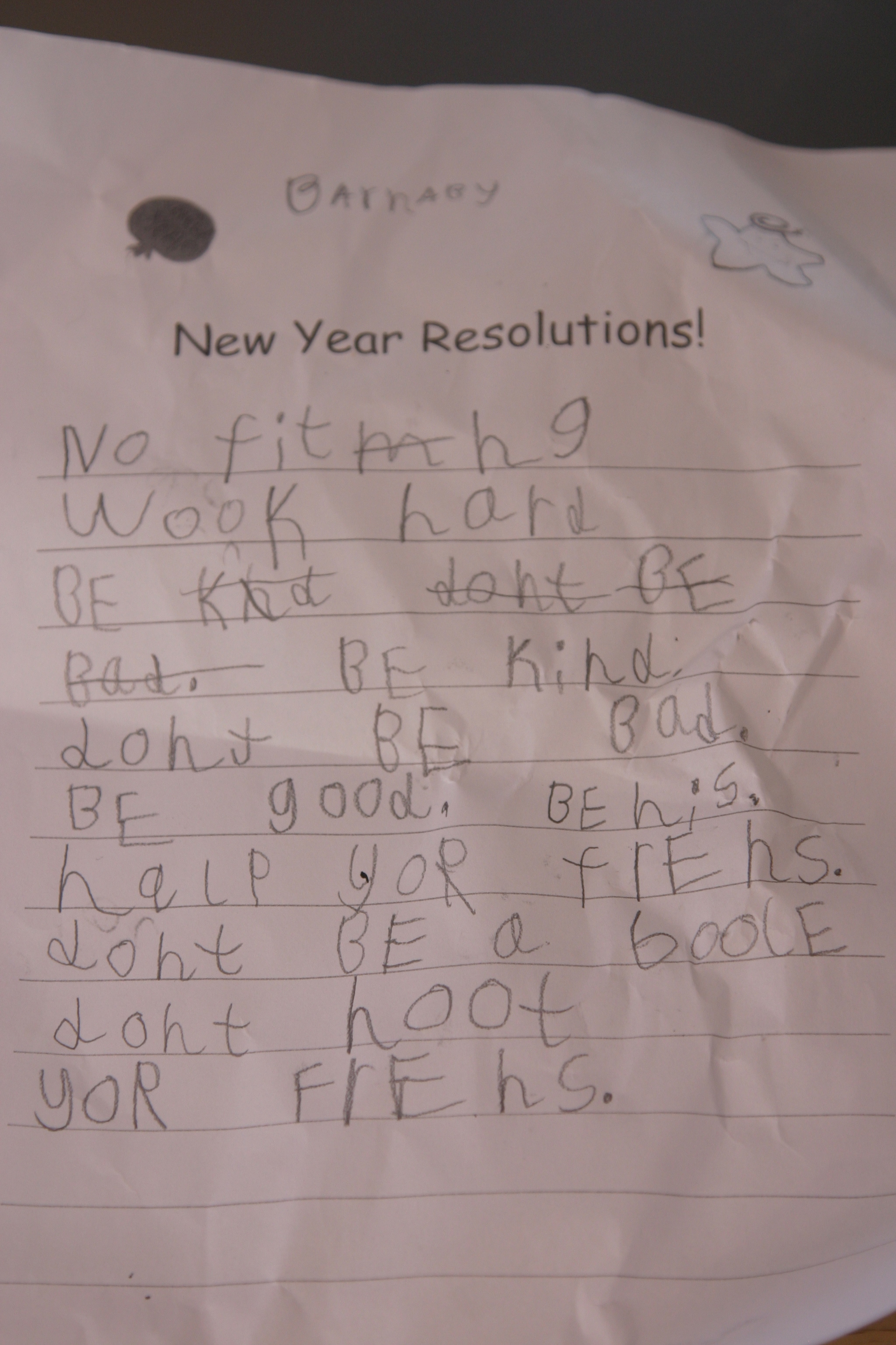 I love the resolutions! and I understand the phonic writing style so applaud his goals. Maybe he can persuade his siblings to have similar noble aims of not hurting friends and to be good 🙂