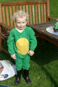 Casper wore a dinosaur polyester sweaty suit. He lost the headpiece quite early on, which velcroed under the chin, giving him a very tight hat with a tail-bit that was covered in spikes. He also had green polyester dinosaur shoes, but was wearing them under the Scooby Doo boots. Now THIS is a good look on the day of your third birthday. Comfort, as always, is overrated: