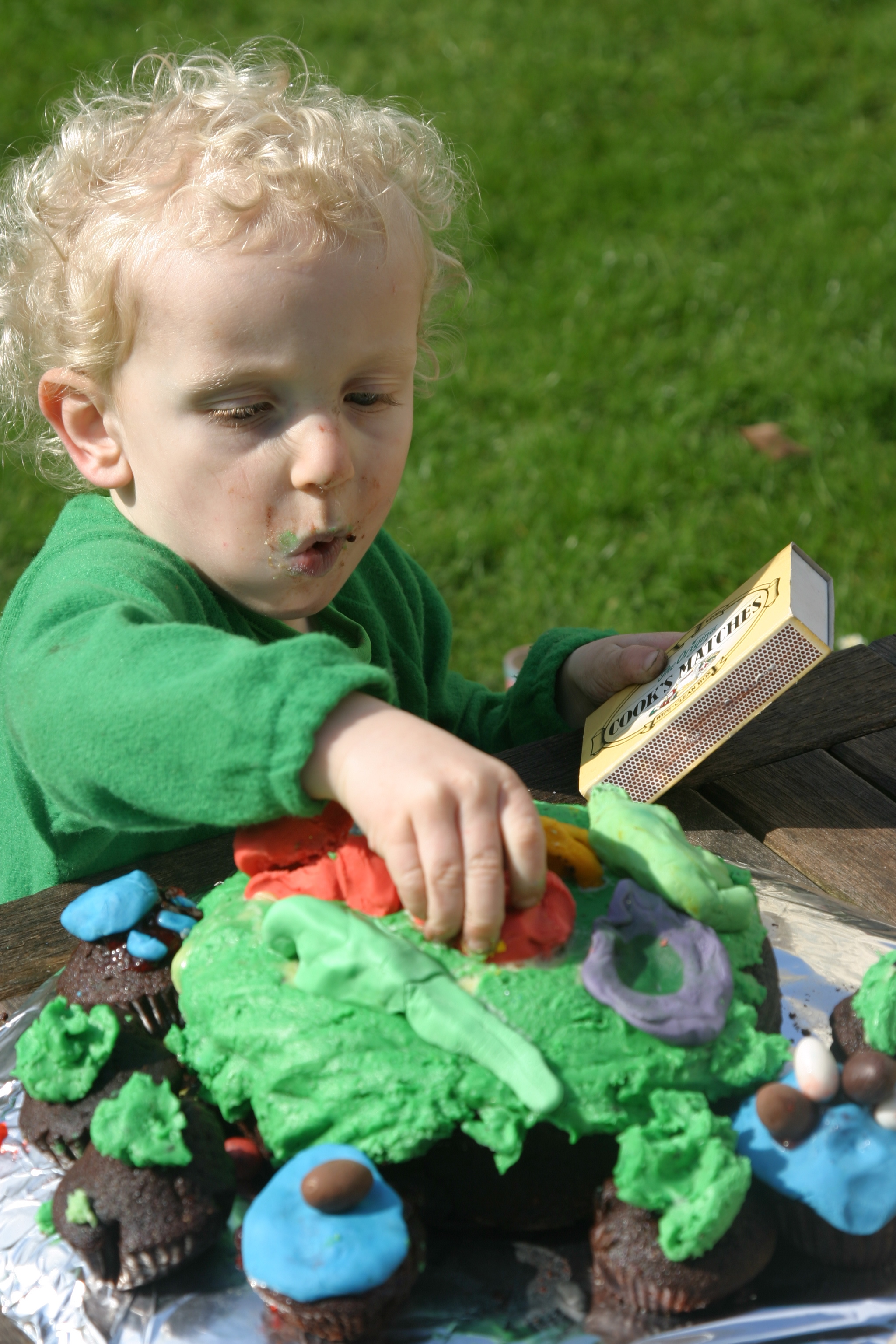 To be fair, and in my defence, I had “help”. The cake was supposed to be a VERY CLEVER dinosaur cake, for Casper’s 3rd birthday yesterday. I had very grand plans for it, but the children all woke up on Tuesday in pools of vomit, and so couldn’t go to school, and so my cake making day was besieged by three keen, yet entirely unskilled, chubby-fingered, sugar-hungry, dirty-fingernailed children. And at some point, I just surrendered to the horrible colours and the lumps of misshapen royal icing (which were supposed to be dinosaurs, apparently) and the bits of picked-off cupcake all over the floor and the split icing which oozed with waxy butter and the sticky jam that ended up being eaten from the jar with a spoon under the cloak of the dining room table. It was all really unfortunate. And, after all that, here is the only evidence that anyone was tempted to eat it: