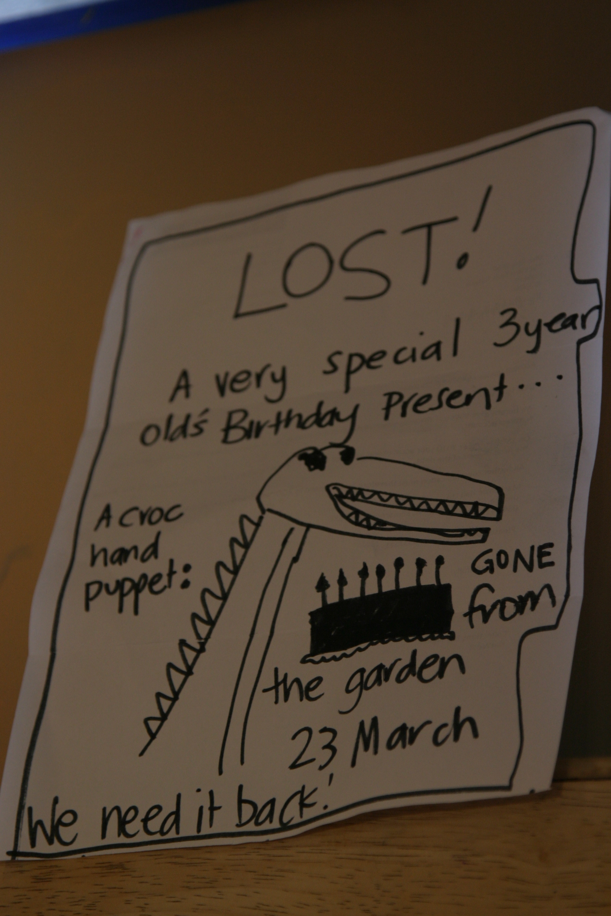 Casper was given a crocodile hand puppet for his birthday. It disappeared in our communal garden. I thought it would be in the shrubs. It wasn’t, so then I thought one of the privileged little kids who share the garden and who are largely cleaner, better-behaved, and therefore sneakier than my children had STOLEN IT. I made a poster, a plaintive, begging poster that I stuck on the swings to SHAME the thieving children and their complicit parents into giving us back the crocodile, and I took Casper and Ned into the garden to call loudly for the crocodile to come back, throughout the day. Here is the poster: