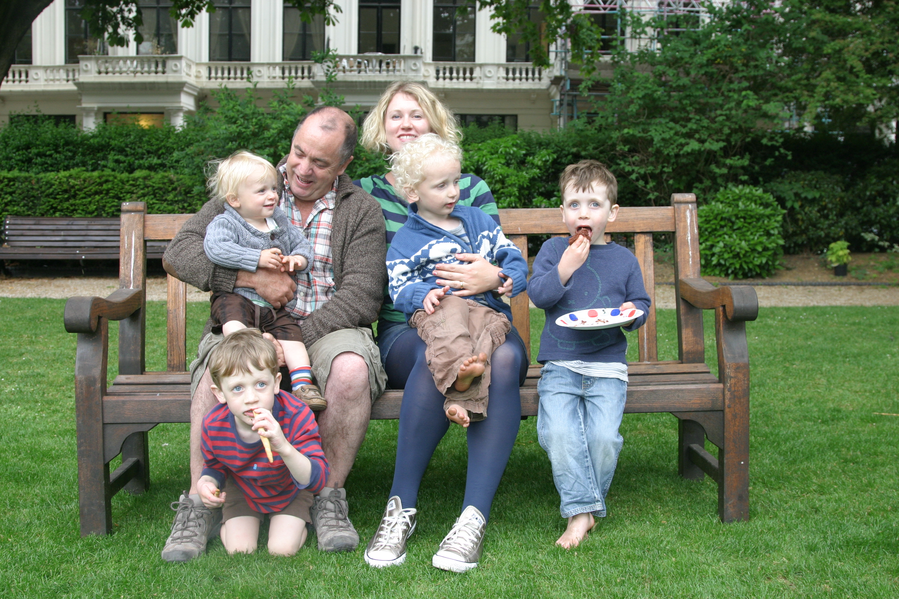 Here is a photo taken last week in our garden. This is all six of us, after ingesting cake and blackened sausages: