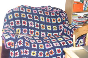 My new ebay 50’s wool crochet granny blanket, competing for attention in a living room destined to overload your sensory capabilities (and probably acrylic):