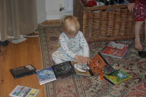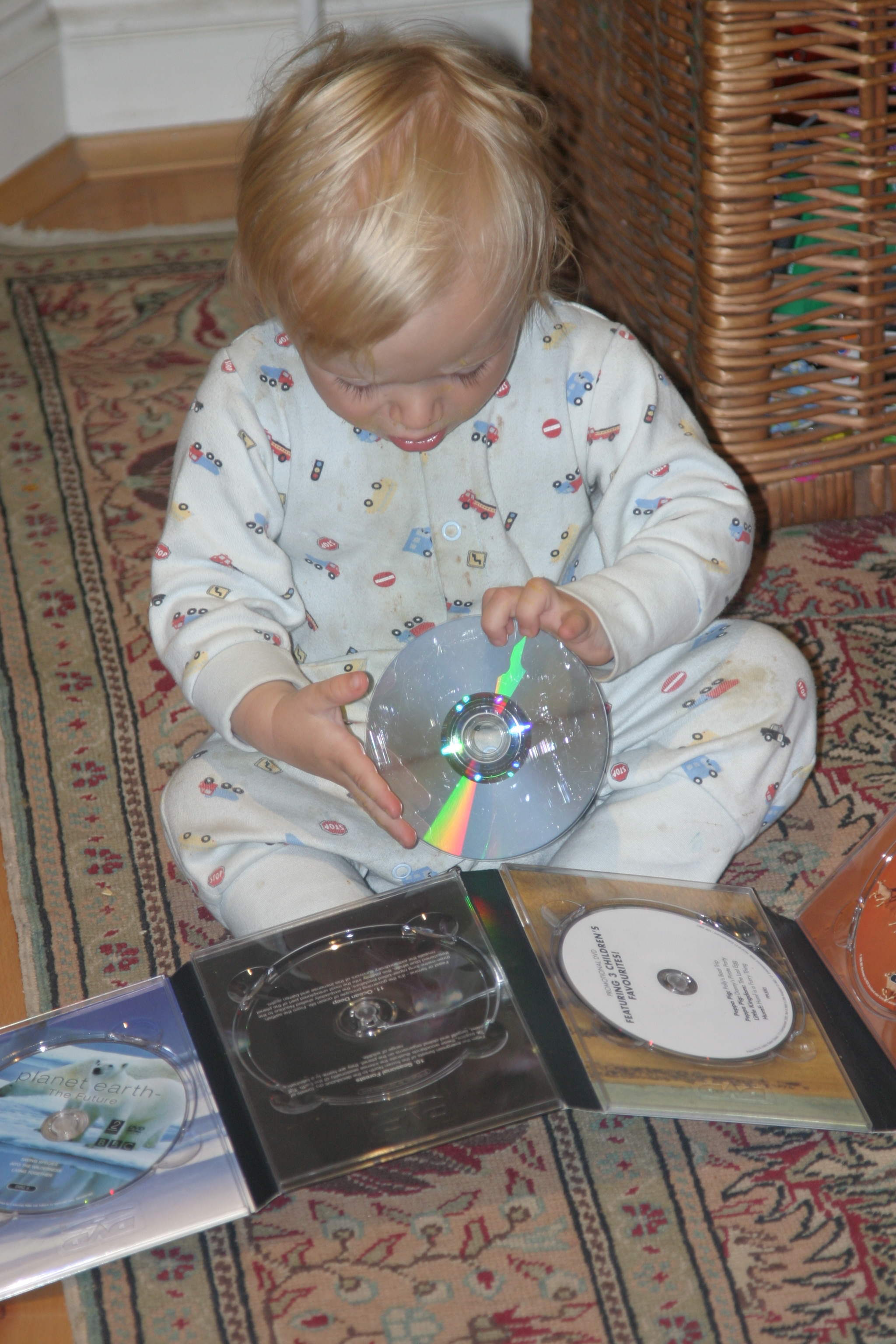 The baby carefully removing the BBC Planet Earth DVD’s out of their cases, then preparing to rub them shiny-face-first onto the rug:
