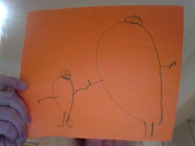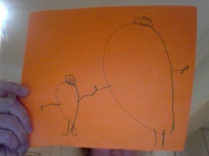 Meanwhile, his brother, who is perhaps less artistically gifted but no less perceptive, has come up with this lovely drawing of him and his enormously-wide-girthed dad: