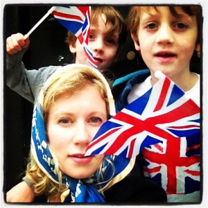 So. Other than that, we have all been getting wet and cranky in this oily rain. The Jubilee was a fizzer, and it felt like everyone else was having fun except for us, but I suspect that actually everyone was equally wet and kind of underwhelmed. We tried to see the flotilla but just got wet and lost and ended up going home, on a crowded steamy bus, smelling like wet labradors with our sodden flags and shivering children. Here we are before we set off, as enthusiastic as you please, attempting to be a bit British, with me in a homage to the Queen, looking like I was 45: