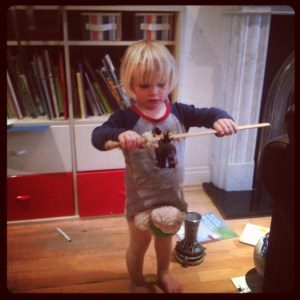 I shall end on this. The baby is toilet trained. He now wears knickers, and he stuffs them with cars or small teddies and wanders around with things poking out of his pants. Often multiple pairs. Here he is, with poor old teddy in his undie-pouch: