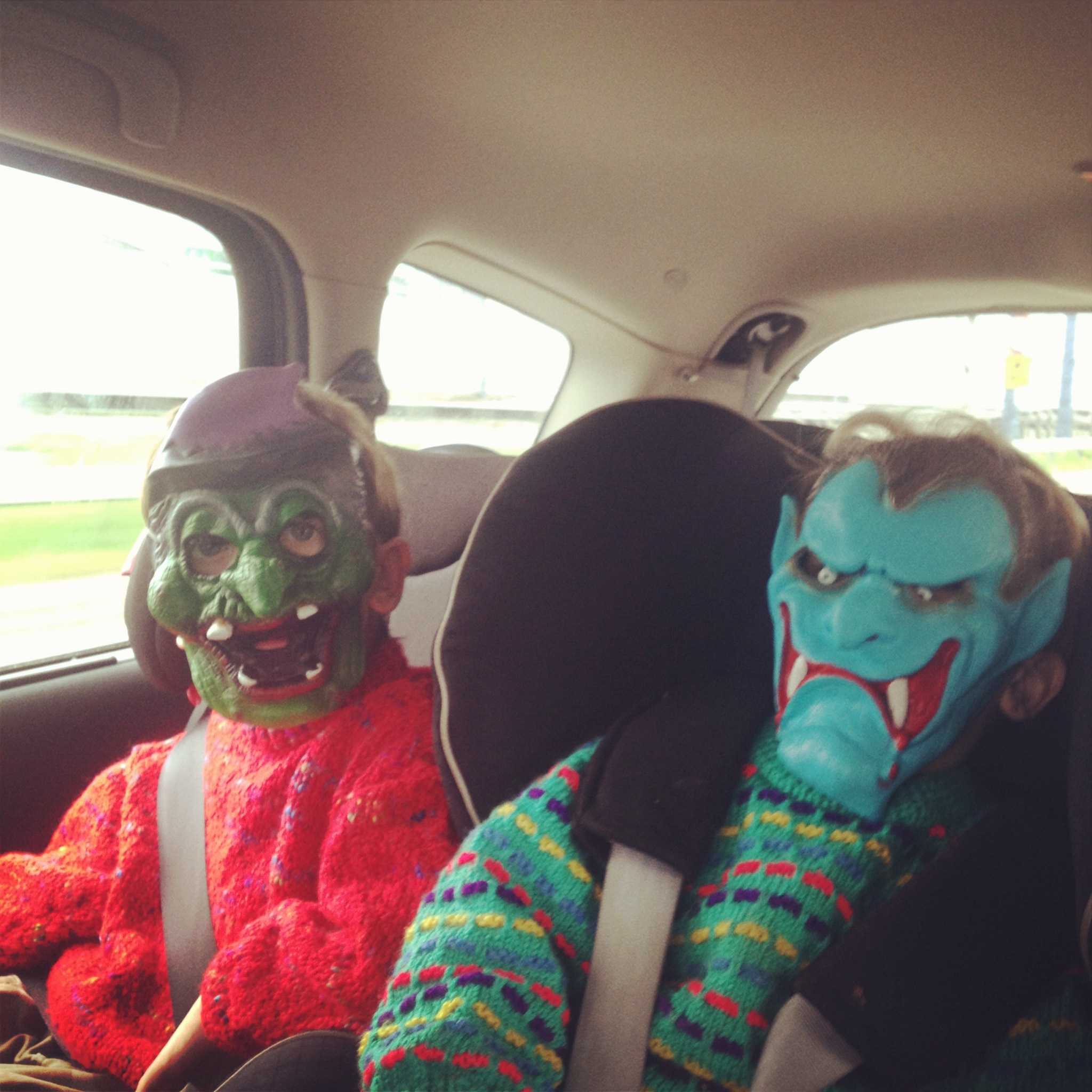 So, along with boyish fighting which is becoming increasingly intentionally harmful and vicious, and trick or treating on Halloween in the American Banking Suburbs which were completely mental with fake spiders draped over five-storied Georgian mansions and Filipino maids dolling out candy while the young Ralph Lauren-esque Banker Mother smiled beatifically at the hordes of small vampire brides and werewolves queued up at their cobwebbed gates, we did a bit of this (in our nana jumpers, naturally):
