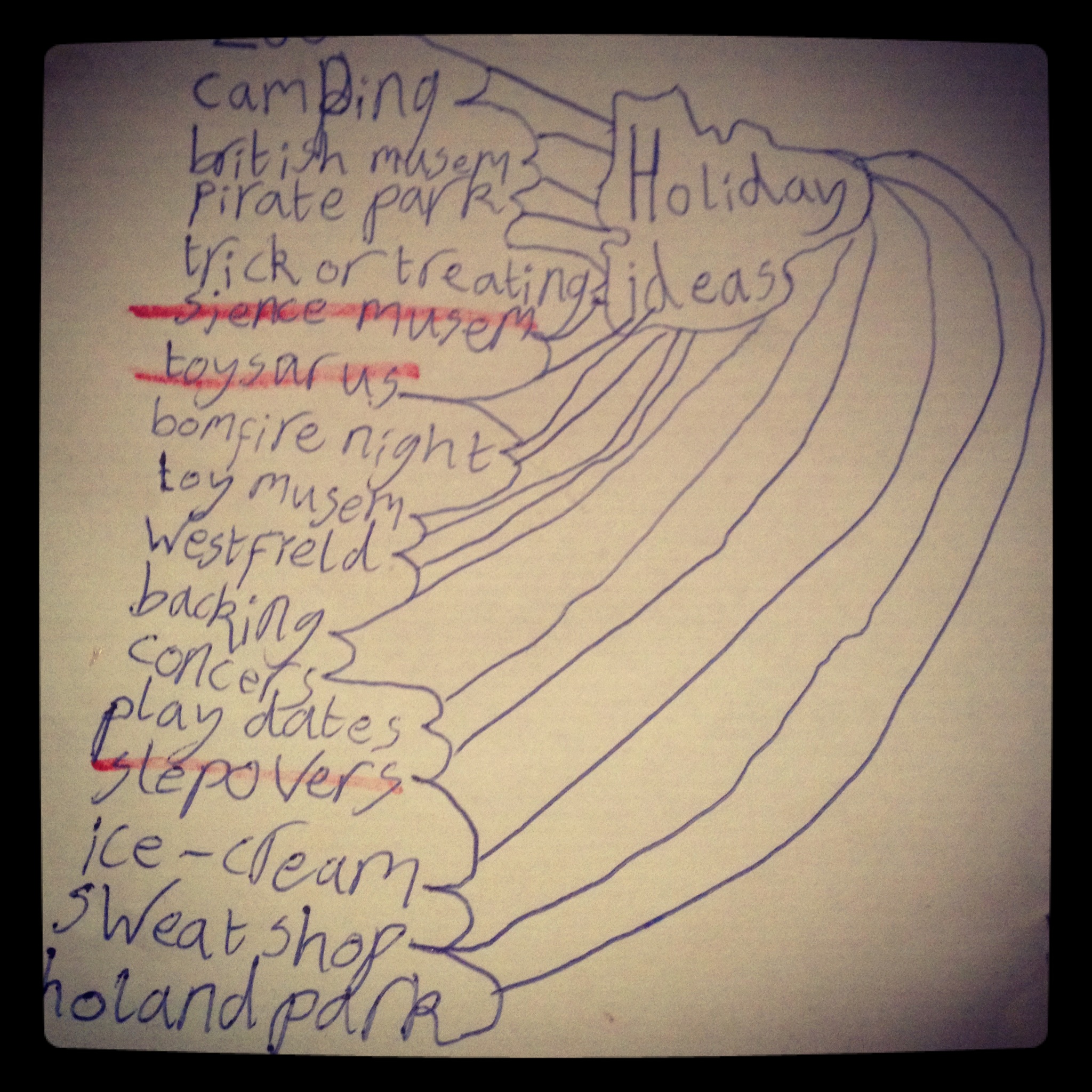 Here’s our holiday list, written down so intriguingly by Barnaby after a small-child-meeting, chaired by me. We pretty much did everything, except the camping (too cold), the sweatshop visit (too hard to come by in Central London) and the ‘concers’. I’m not really sure what the concers are. Concert? Cancer? Conkers? Probably conkers.