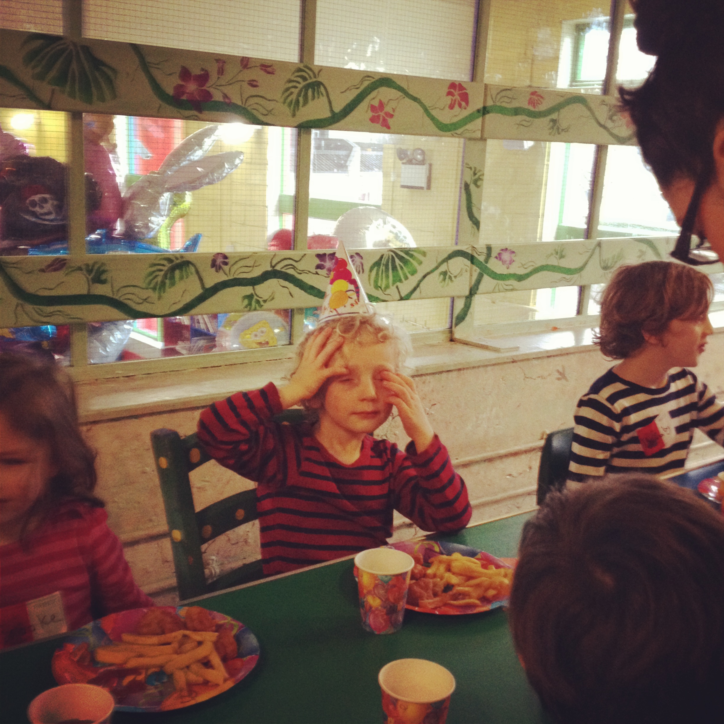 Casper turned 5 today, and we went to Bramley’s indoor play area, which was just as well as it is snowing a ridiculous blizzard outside. Every year we have had Casper’s party in the garden. This year, we had to huddle somewhere inside for sanity’s sake. Here is Casper recovering from an altercation from a Dad who marched up to us all and demanded to have ‘a word’. I said ‘Yes?’ and he told me in a very angry way that his daughter told him that he had punched his kid and that was unacceptable and that if he couldn’t be controlled he shouldn’t be allowed in a public place.