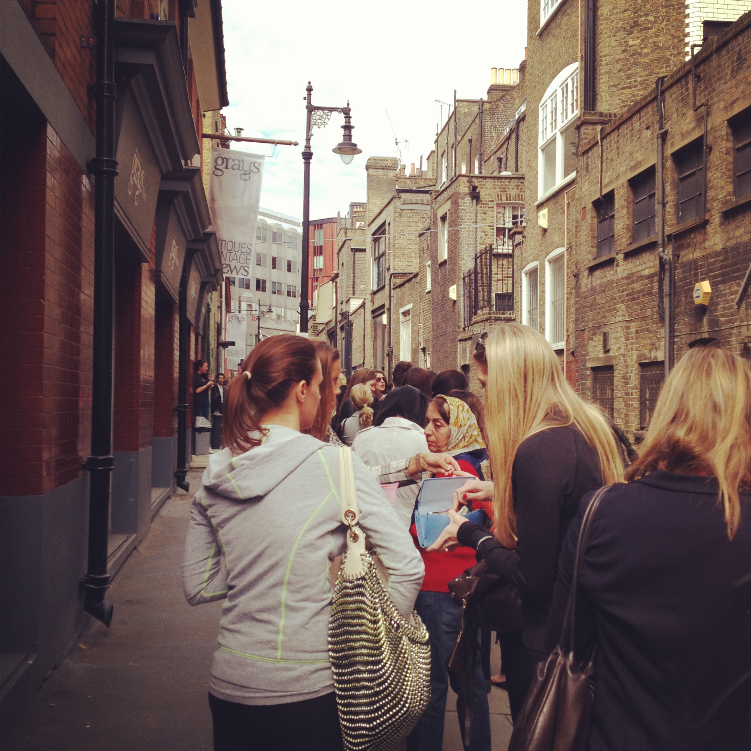 2. The sample sales have been kind to me. The Stella McCartney one had knickers for £5 and bras for £10, and lots of terrifyingly well-dressed rich women who were talking about Aspen and New York and weddings in Tuscany. And it took an hour to queue to get in and an hour to queue to pay, but my underthings are so silky and new, it doesn’t matter. And a trip mid-week to Bicester saw me buy a Prada lace collar which, sadly, doesn’t do up. But it could, if only I knew how to sew things. Here’s the queue and a smattering of rich girls in their pilates gear: