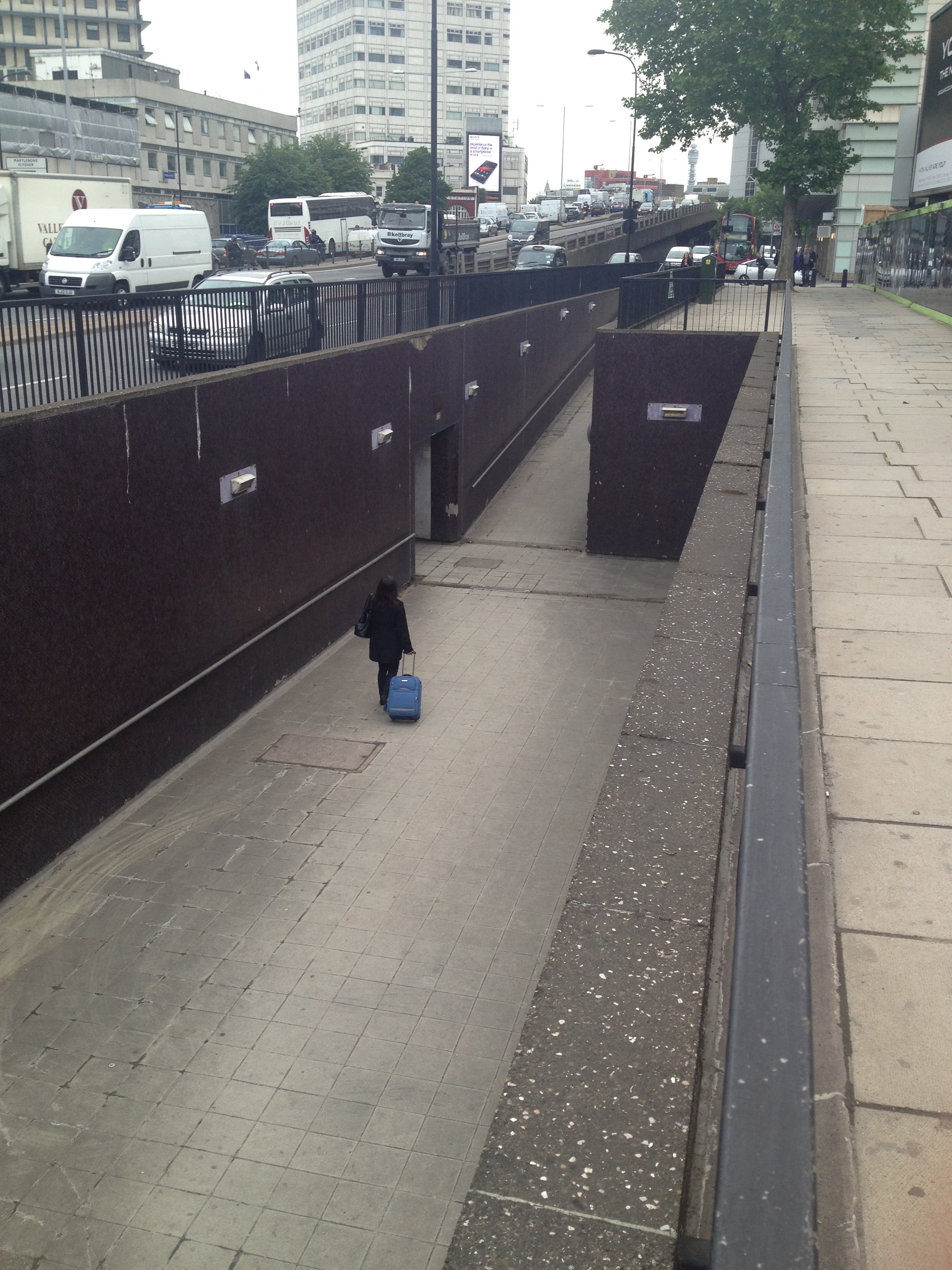 Not only with a sharp knife, though, on NO! It turns out that they are clever little urban gymnasts too, in the manner of stylish French inner-city teens schooled in the ways of parkour cement mastery! Yes! So, we were a little late to leave for school the other morning, owing to some usual stupid lost shoe/staring at the tv/running into the bedroom at the last minute to find something no one has thought about in weeks/desperate poo/forgotten viola type scenario, and so we had to run a bit all the way, with the less-than-melodious accompaniment of my shrieking voice telling them to stop being so slow and passive-aggressive and thoughtless in the mornings, and then we passed the bit near the subway against the A40 which goes deep underground about a storey’s-worth, under Edgeware Road, and I’m running to the lights, and shouting, and then I notice that Casper and Noah are not beside me, and have disappeared. So I turn back, losing all those precious seconds I have gained while puffing along, and look for them, and see they are scaling the ledge above the subway, one hand over the other like a monkey, slowly, determinedly, one foot in front of the other along the thin ledge, careful not to look down into the concrete meters below them, trying to make their way to the other side of the tunnel so they can scramble over the fence and then eventually get to me. There was quite the crowd of commuters assembled, watching, horrified, and looking around for the absent mother who, by this point has turned the buggy around so fast in a rage, and tipped poor old Ned out, then chucked him back in, and ran back to the kids hanging over the ledge, looking completely surprised that I was there, and only a little bit worried at the murderous foam round my snarling mouth and my superhuman strength as I reached over the ledge and pulled them back over the side in a very angry way. Here is the subway:
