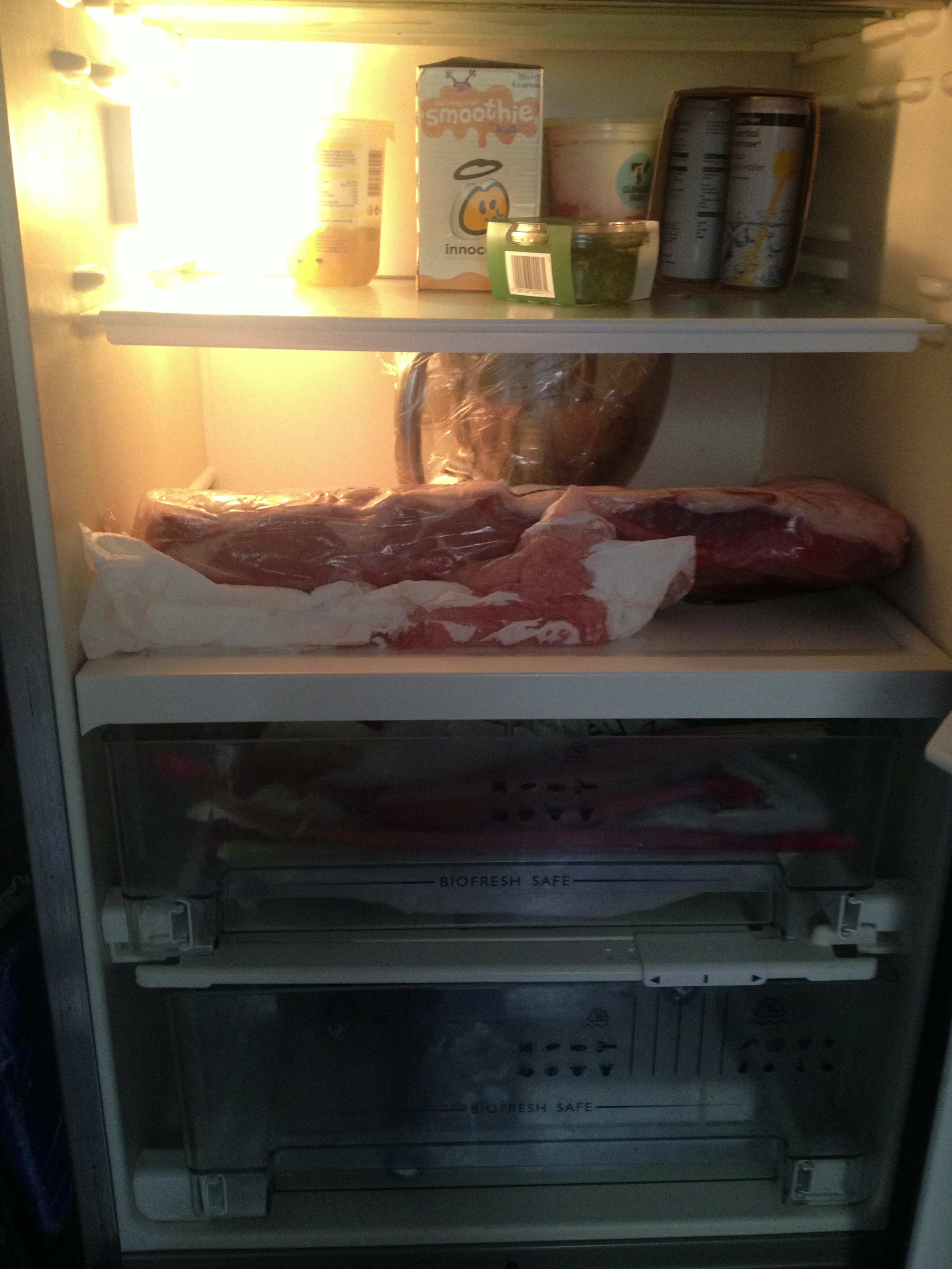1. An alarming amount of sirloin steak (see the bleeding carcass taking up a shelf of fridge):