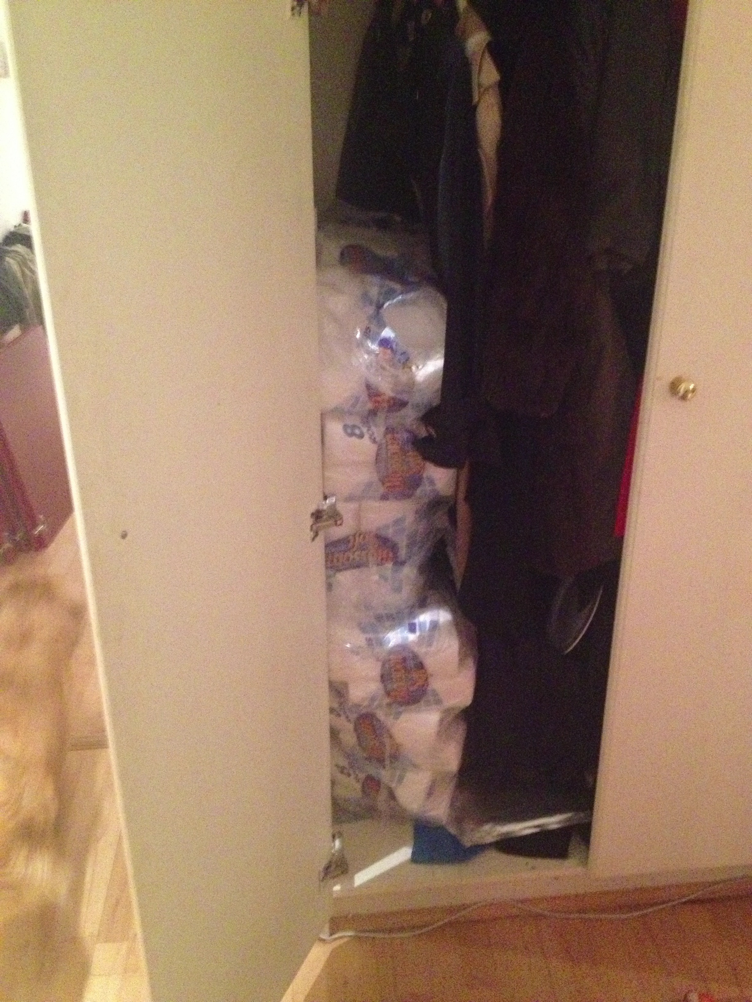 A hidden army of paper towels, shoved in between the winter coats like a disappointingly temperate, absorbent, hygiene-driven Narnia: