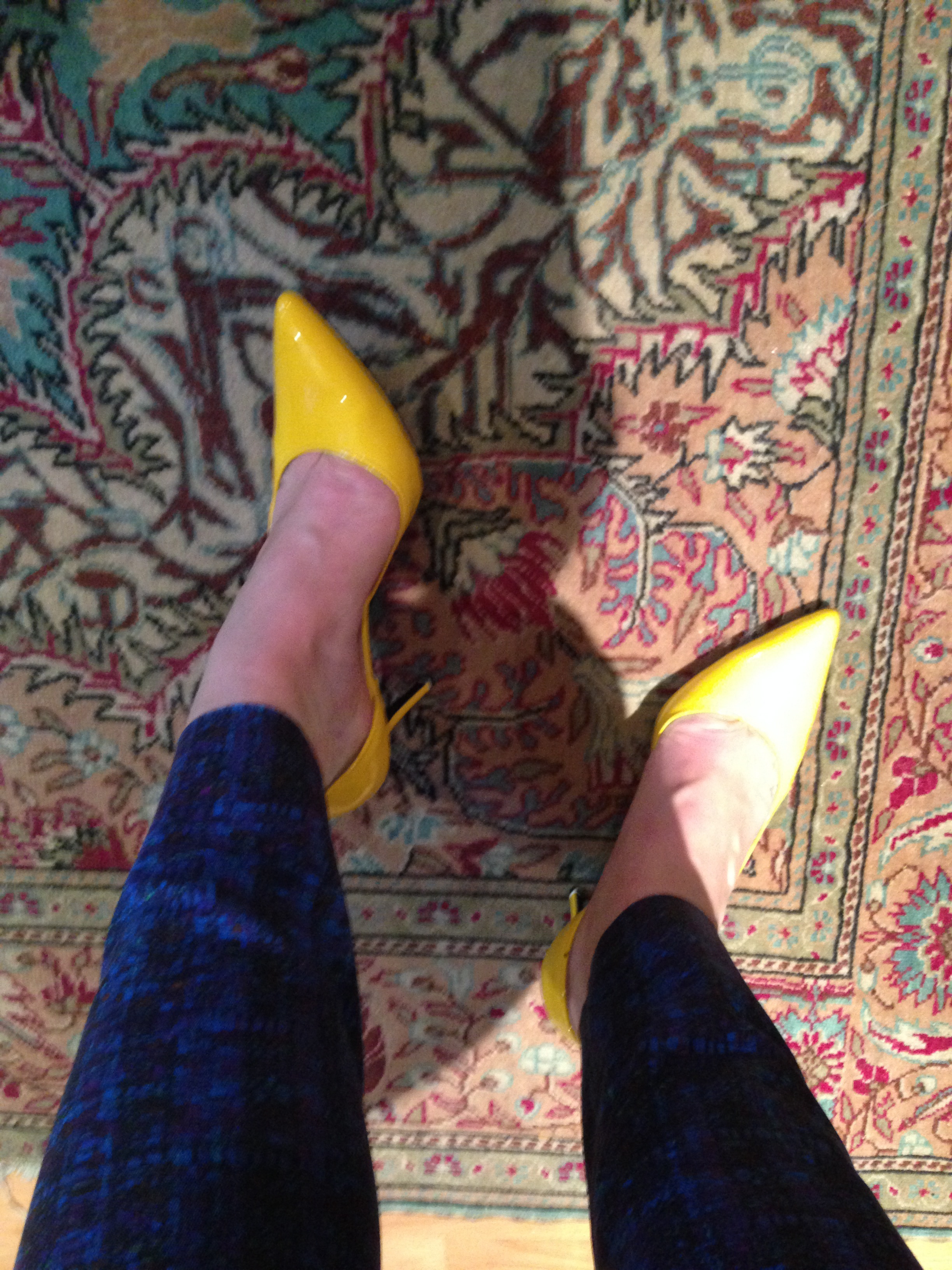 This was a mixed bag, I’m sorry to say. I bought Alexander McQueen black trousers for £50, but I didn’t try them on, and so discovered they were unhemmed and ah, don’t fit. Erdem was excellent, furnishing me with sharp patterned trousers and Nicholas Kirkwood for Erdem yellow pointed heels for £60, but Christopher Kane had an hour and fifteen minutes queue to get in and a fifteen minute coat check line which gave me three minutes to look before I ran back to the babysitter, kind of annoyed and embarrassed by my sample sale compulsion. Here is a highly unflattering photo of the Erdem haul:
