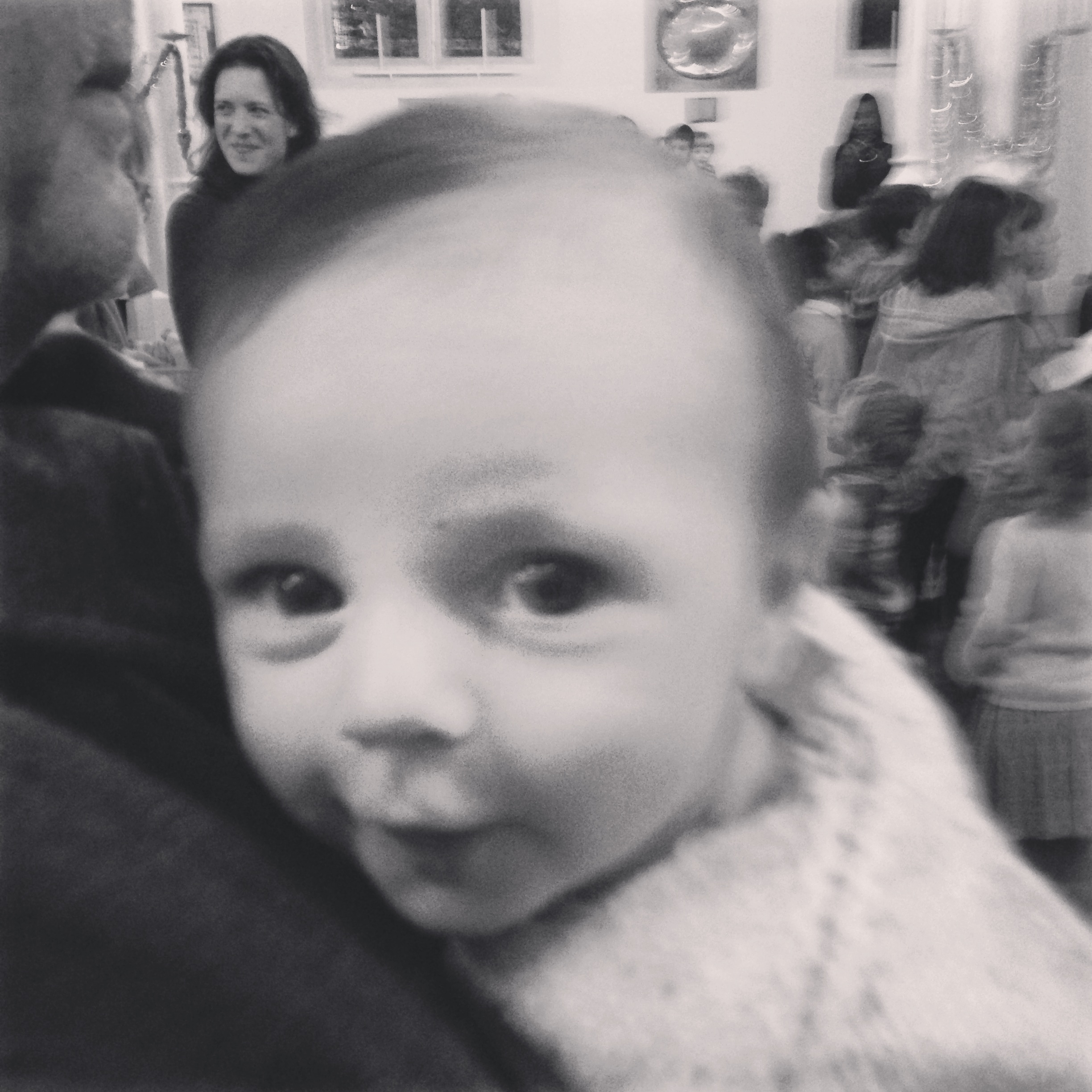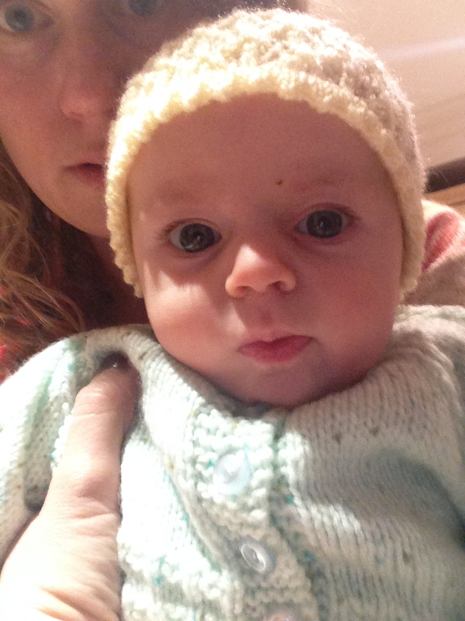 And here is G-Boat, dressed in both lemony/minty knitting from the church fair and his warm bear suit. It’s the Little Black Dress for babies.