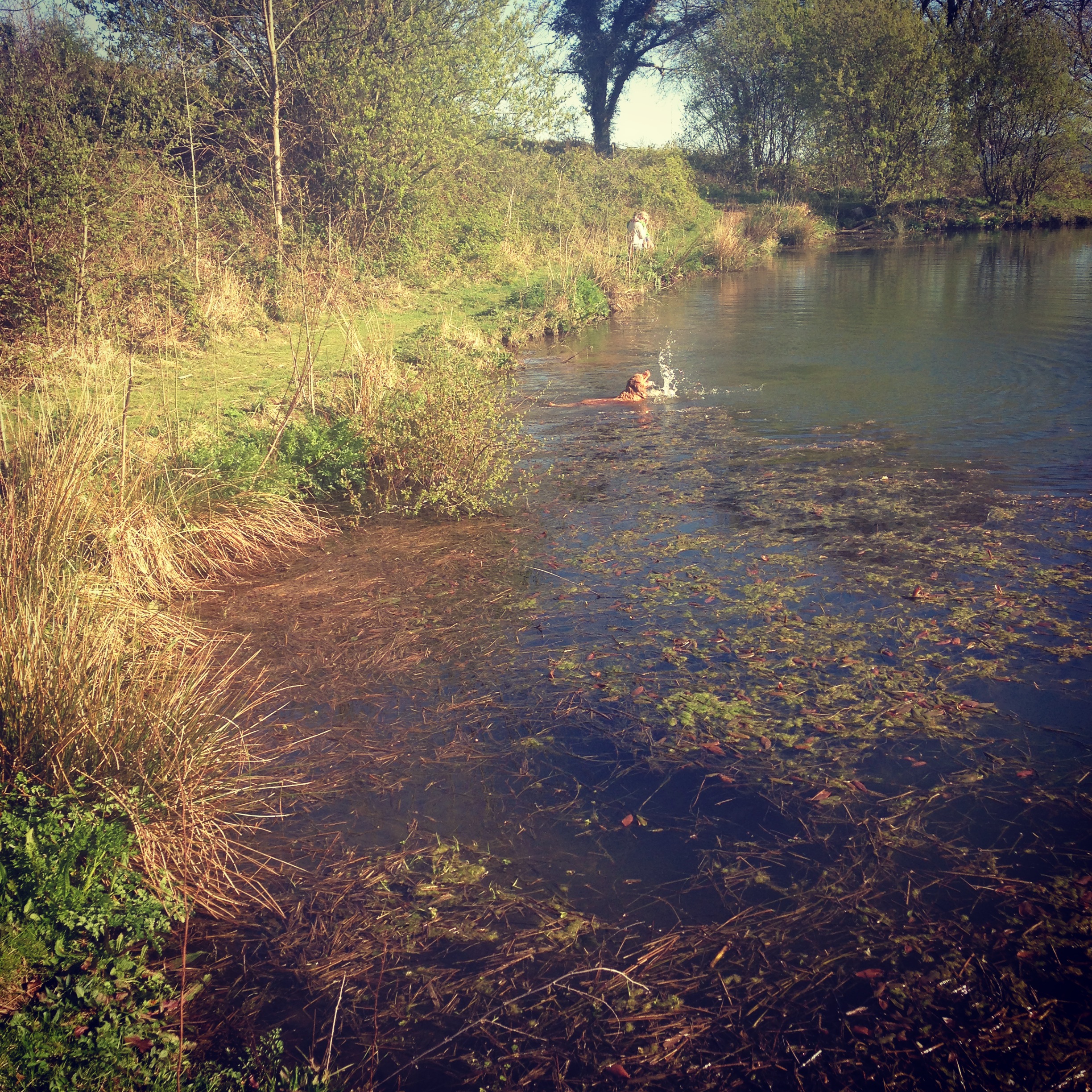 Here’s the dog swimming in the fishing pond. I think he was allowed to swim in there. Maybe.