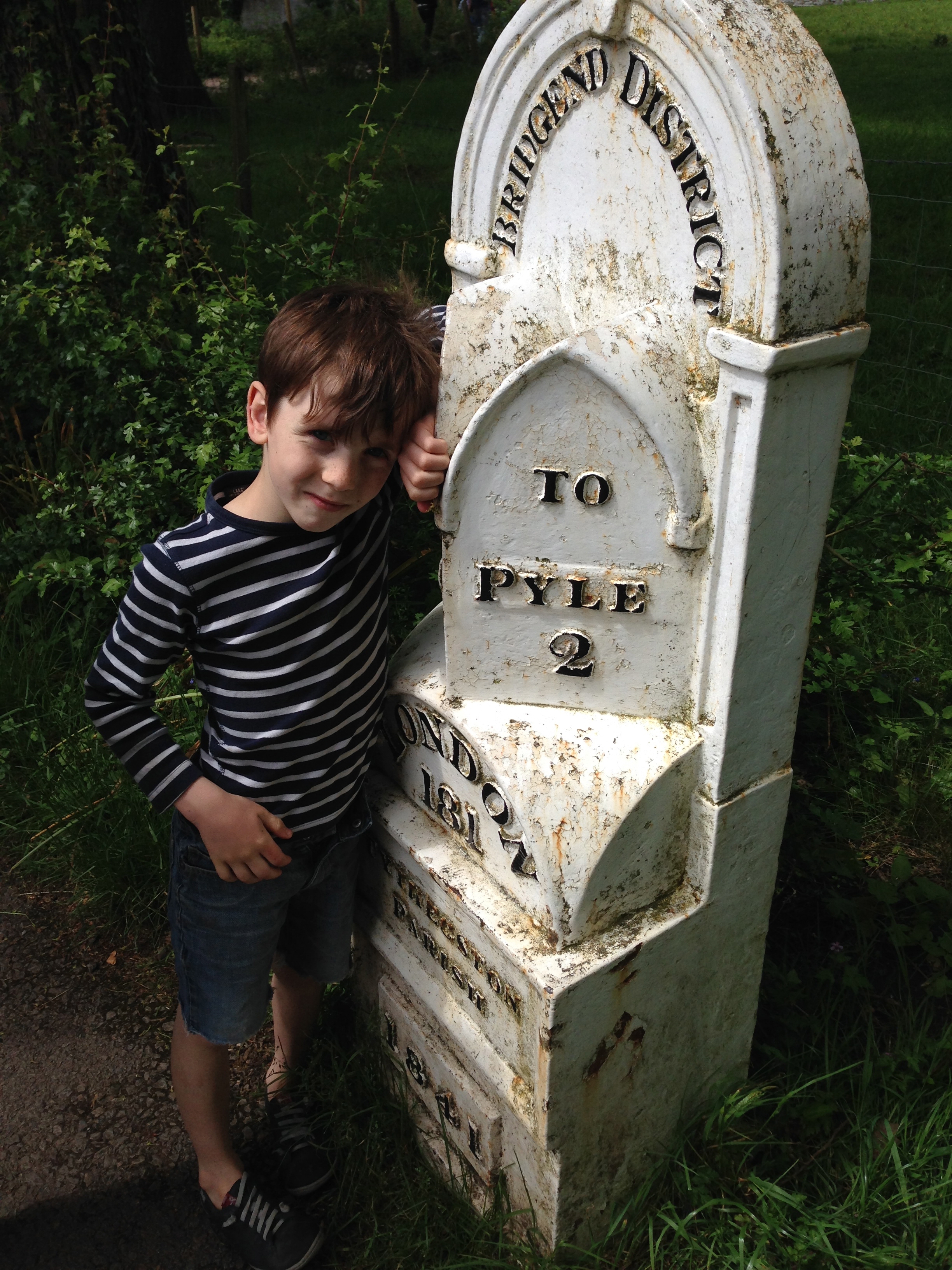 Here is Noah posing outside a re-erected post, emblazoned with my mother’s maiden name: