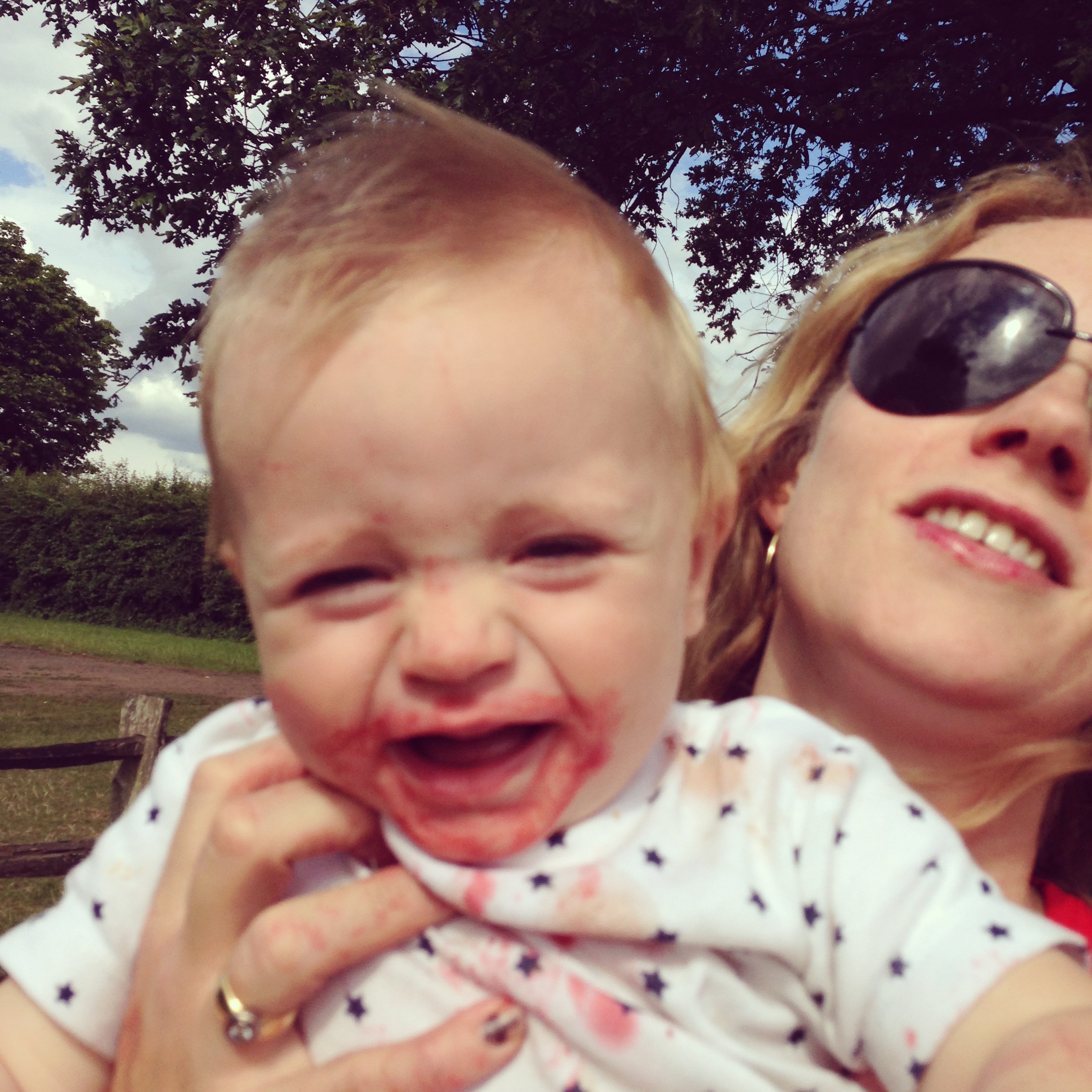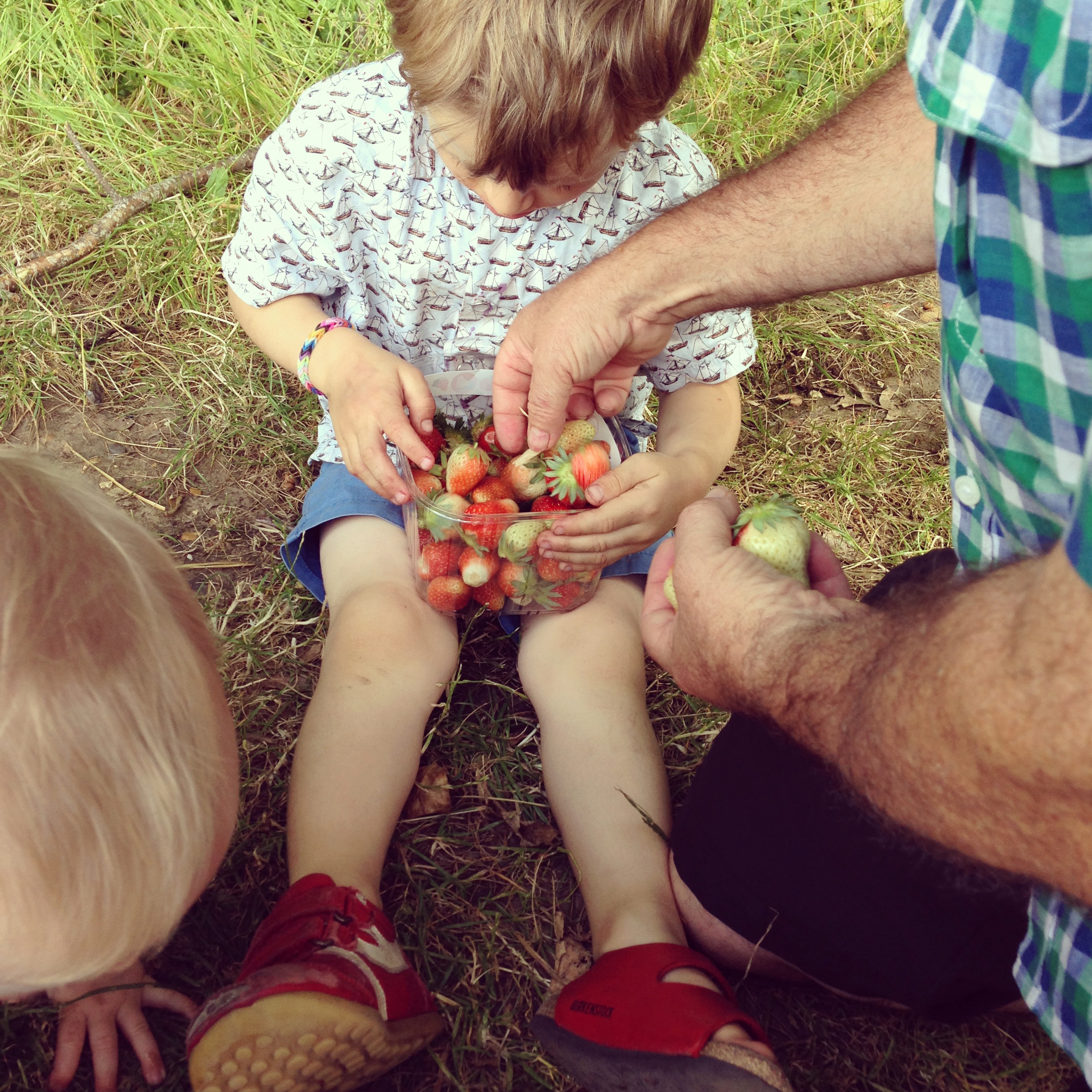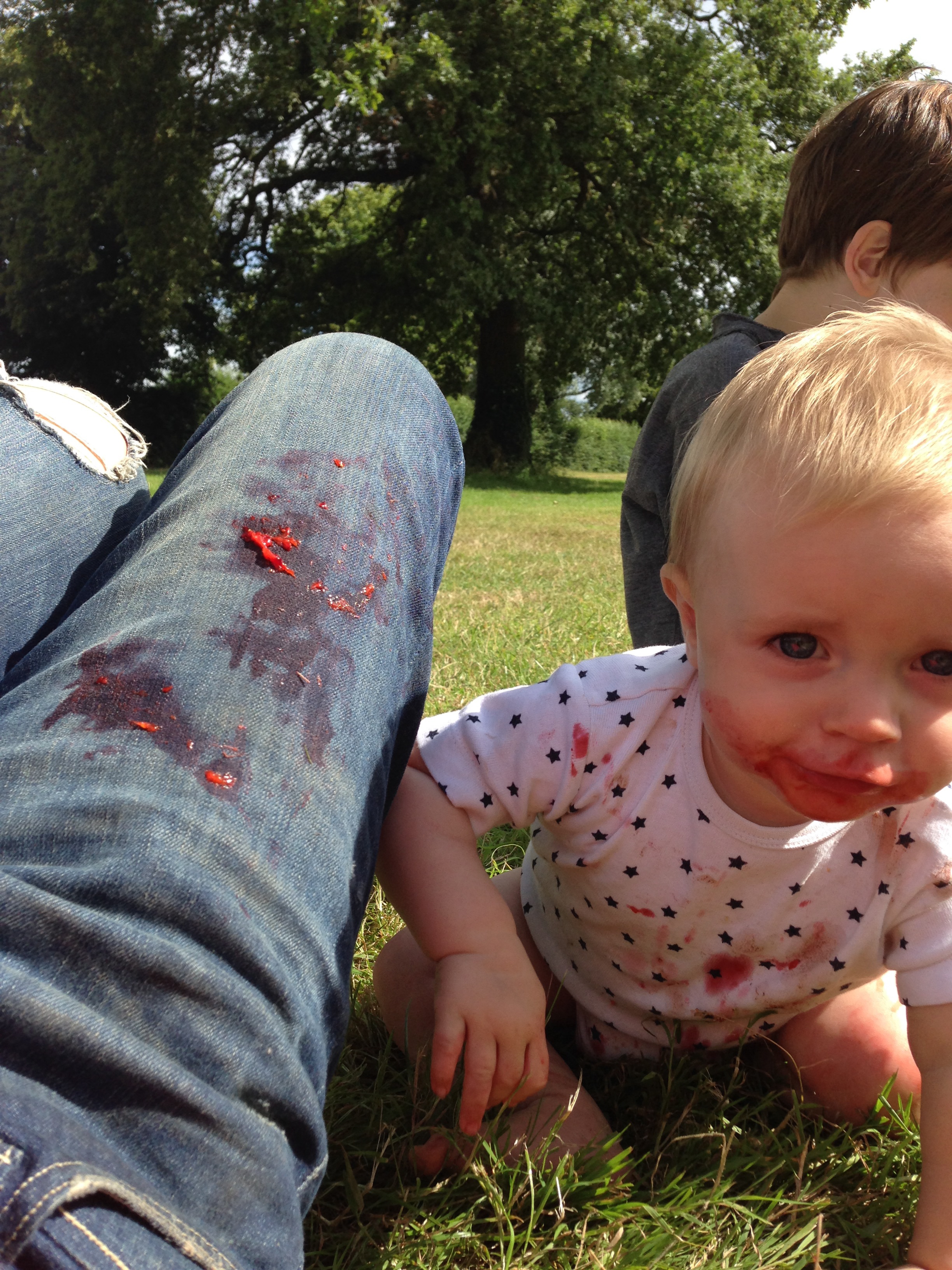 Here is a happier day, after strawberry picking – new Lee jeans, kind of stained, and lovely Otis who is very keen on summer fruits: