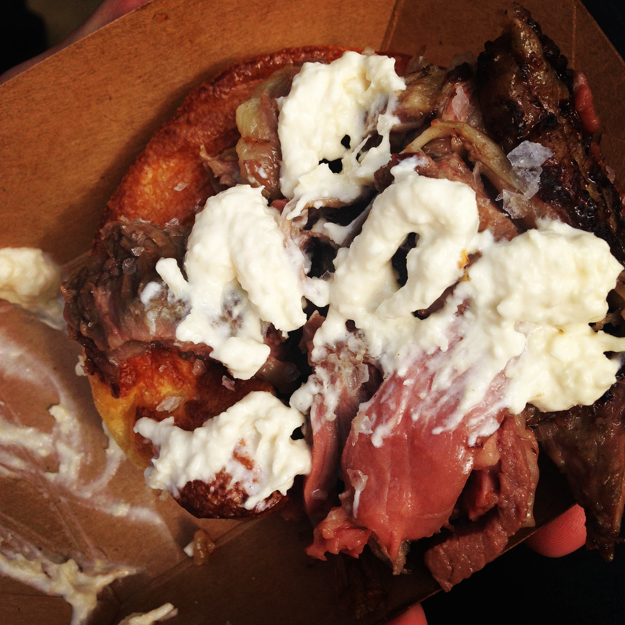 Here is the ox meat, carved, served in a huge yorkshire pudding, swimming in gravy and horseradish sauce. I know it looks vomity, but you have to understand it was a kind of life-changing meat experience, the kind of which I may never have again. Salty, smoky, fatty, dripping, warm and earthly and very, very pink. I am misty-eyed as I remember it.
