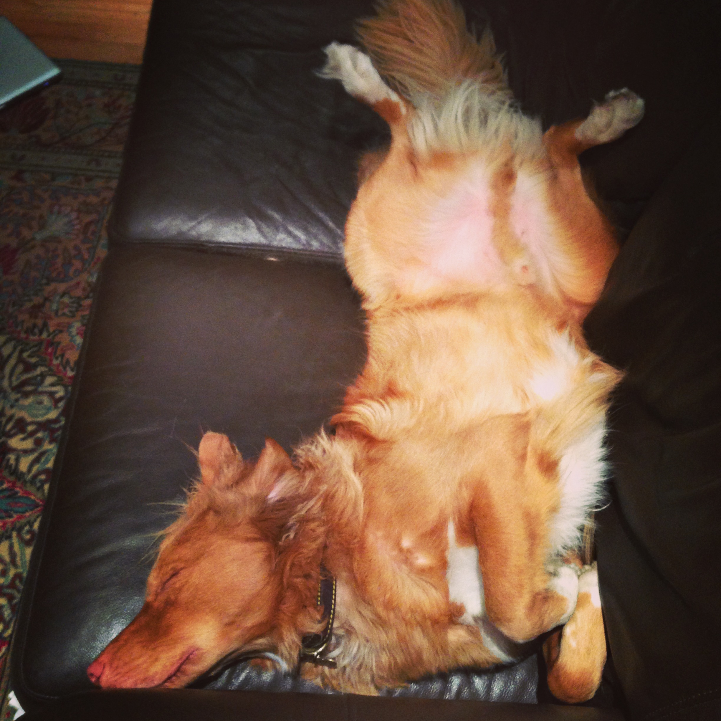 And here is the dog, lying on the couch, exposing himself and dreaming of stolen chicken carcasses: