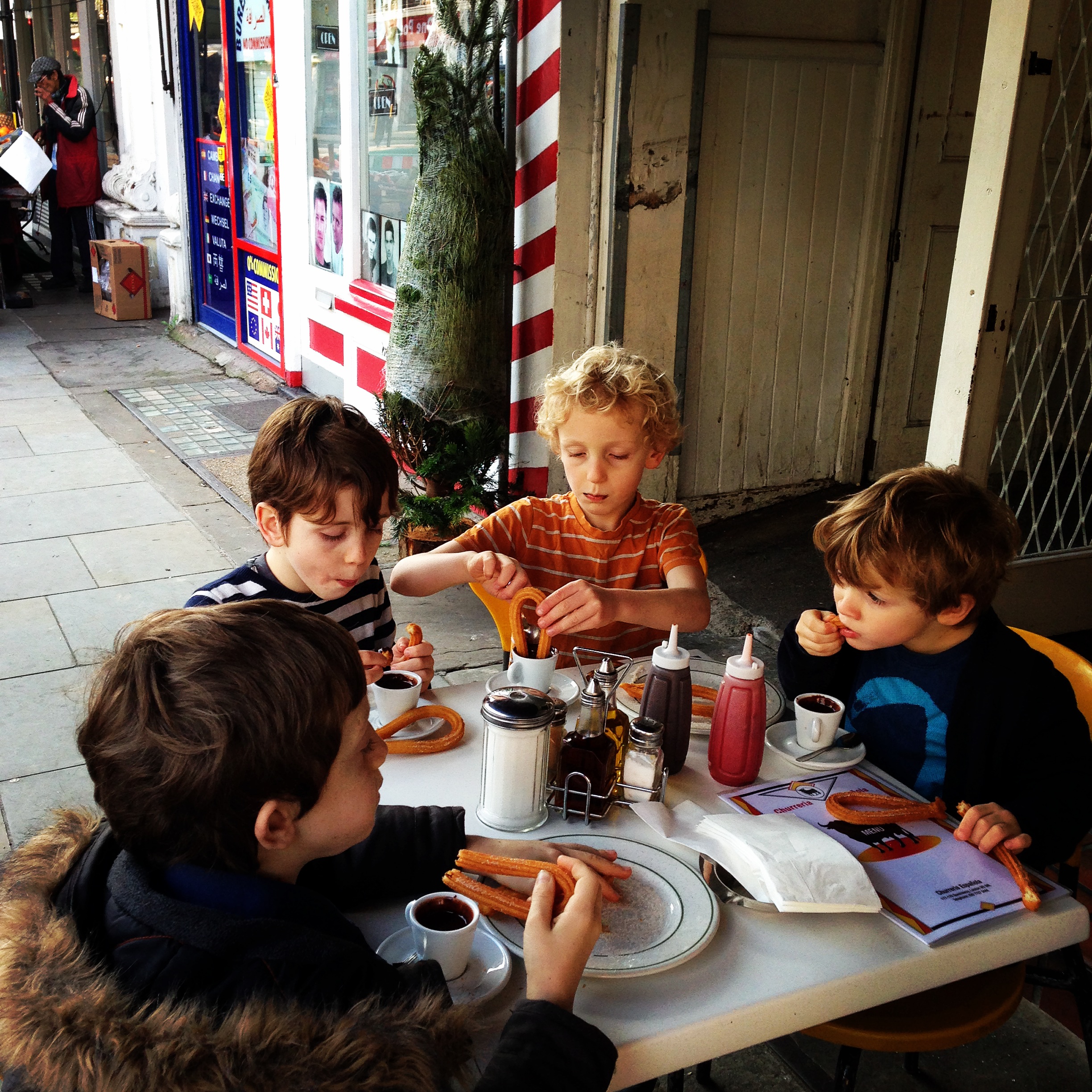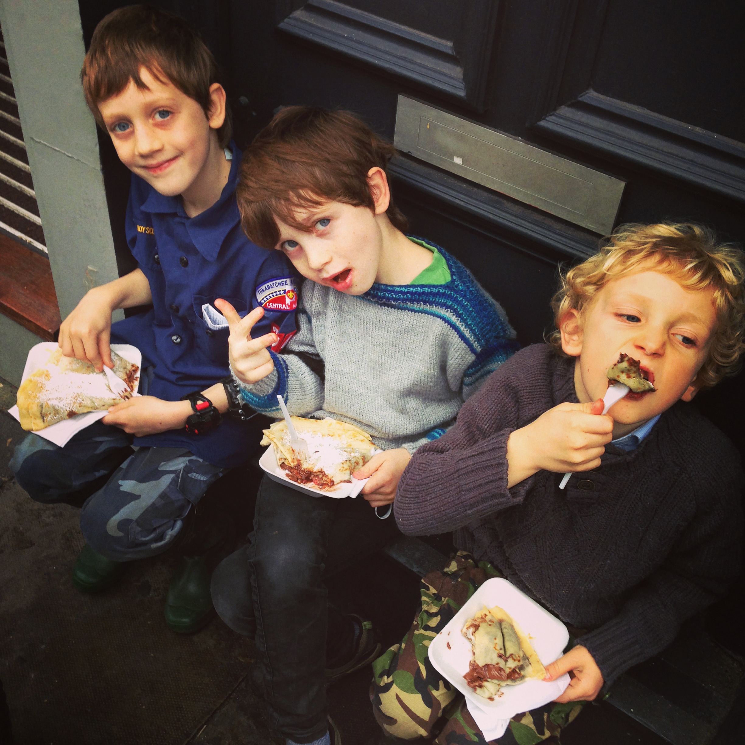 Hot chocolate, crepes, and spanish chocolate and churros (an alarming chocolate theme, I notice). Casper has been getting into lots of trouble at school for his distracting behaviour, mostly tickling other kids and dancing at inappropriate moments, with an afternoon of Tourette’s style compulsive shouting out of the word “PIZZA!” thrown in. And so I take some comfort from that fact that, even though we have some “issues” to deal with, they do eat and sleep, although it may be a little heavy of the cocoa side of things. Still, take it where you can get it, as I said before.