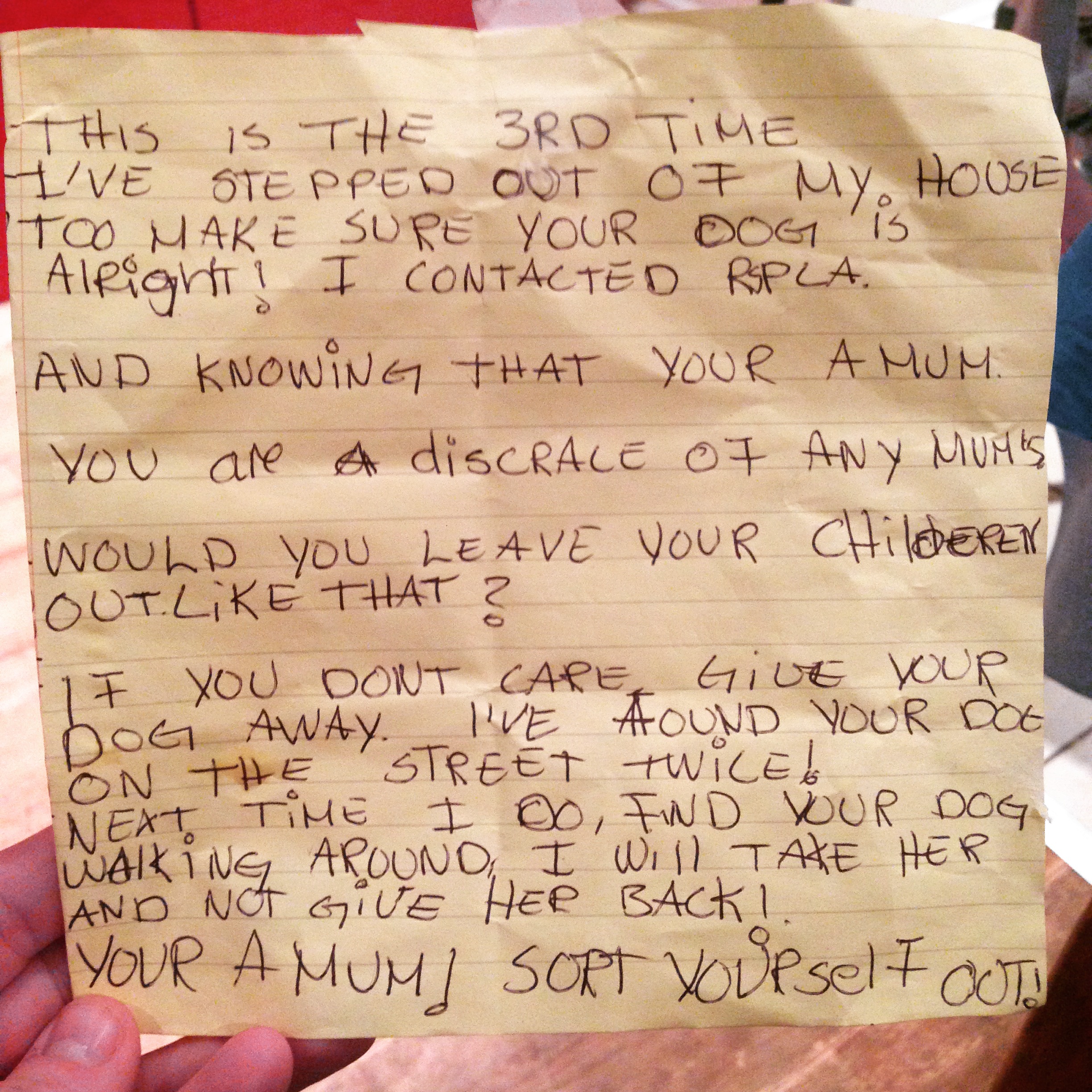 So, there is more. On Sunday, we went out to Whiteleys to look for second-hand books and to get something for dinner. We left the dog outside, the gate shut, water out, etc etc, knowing the dog likes to stand at the top of the stairs and survey the passersby, getting a few pats now and then, barking a bit for effect when another dog or squirrel dares to get too close. We ended up eating at Pizza Express, so got home a few hours later. There was a mean note stuck to our gate: