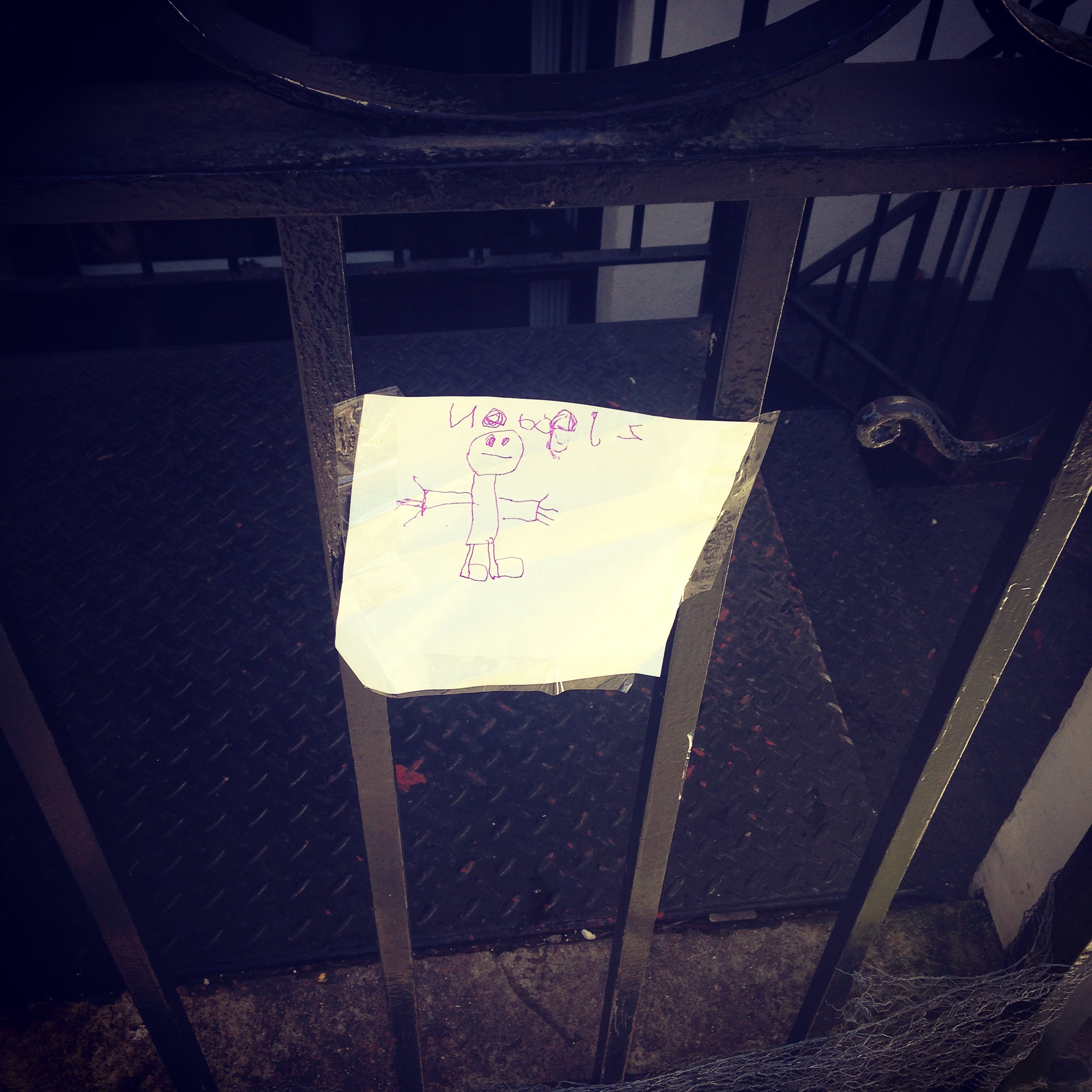 So we thought we could fix their spelling and leave the note on the gate, or we could give devil-eyes at all the neighbourhood until someone cracked from the terrible devil-eye pressure, but then Ned wrote this note which should read “No Burglars” but actually reads “nobogls”, and illustrated it with a kind-looking burglar whose arms are outstretched, desperate for a conciliatory hug. It is a work of genius – it is an unintentional shaming note of neighbourly LOVE, peppered with vowels which could mean anything, from “You Can Bugger Off, The Dog Is From Cold Nova Scotia” to “I’m Really Sorry About My Crapness At Caring For Animals”. It has been stuck on the gate since Monday morning.