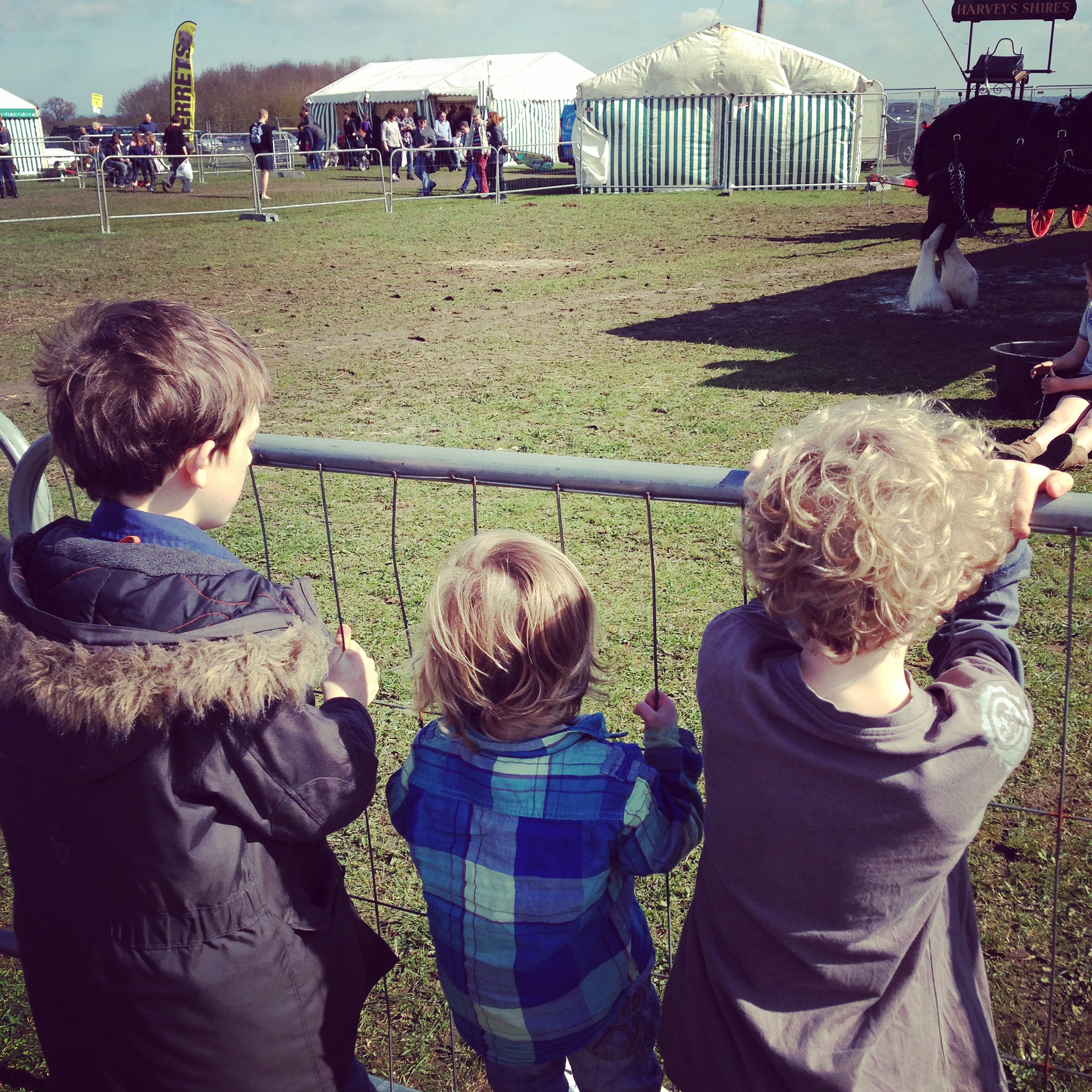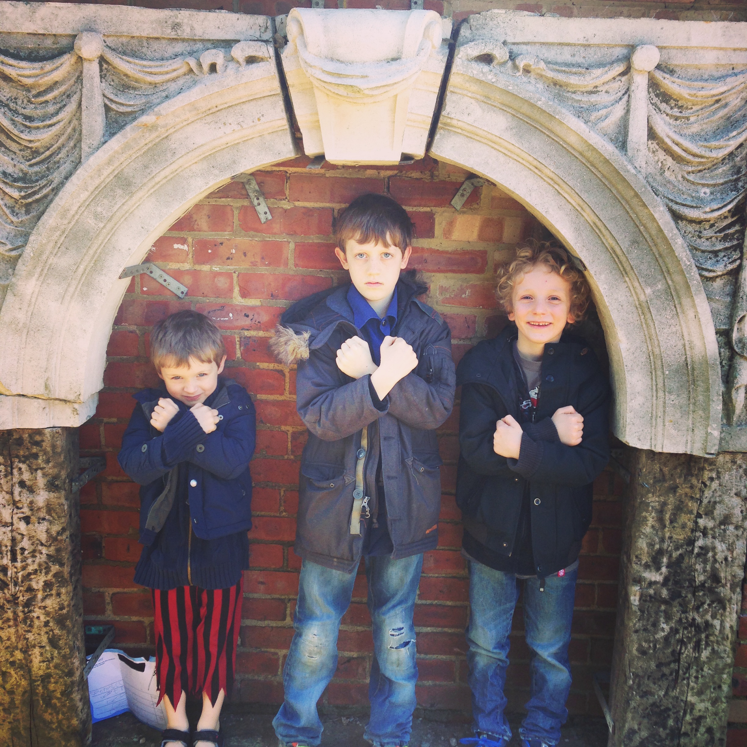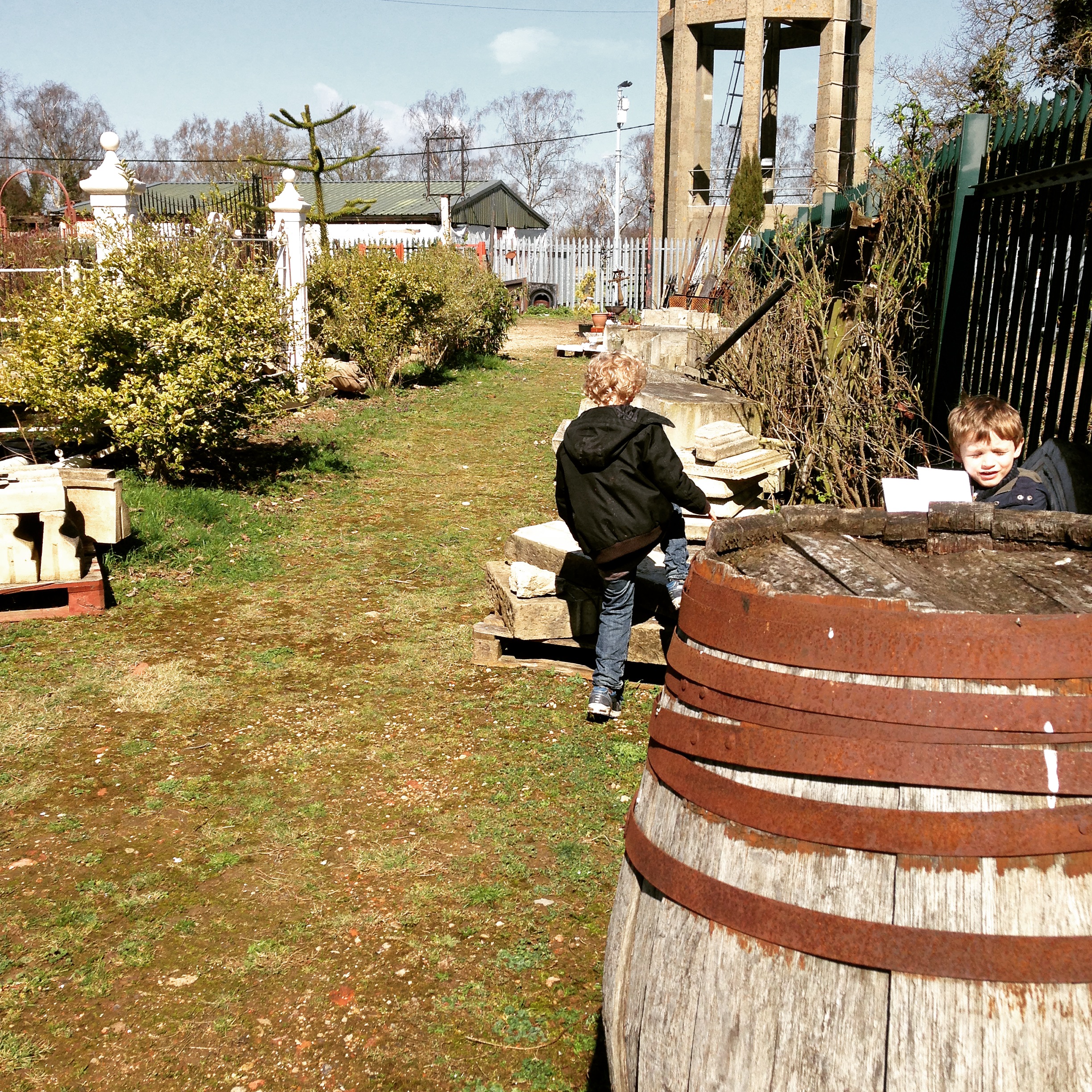 Then on Easter weekend we drove to Oxfordshire to Lasso, the reclamation place, and the kids tried to push over massive plaster columns and stuff, and we ate fried ox tongue and chips, and felt like we were properly in the country. Buoyed up and enthusiastic, we followed the yellow signs to the Thame Country Fair, and spent about £50 getting in, and then it hit me how much I really hate those sorts of things, with the jousting and duck decoys and the stalls of tweed caps and indoor displays of special kitchen equipment that you really wouldn’t ever need, not when you have a knife, and rows and rows of portaloos. Noah went in and fell out of one, and told me later not to do any ‘ureen’ if I went in, because it won’t be heavy enough to push down itself, and I would have to shove my hand down the toilet to release it. I asked him if that is what he did, and he looked a little bit shy and went quiet. Here they are at Lasso, giving me heart attacks with the casual climbing and touching and vampire-impersonating: