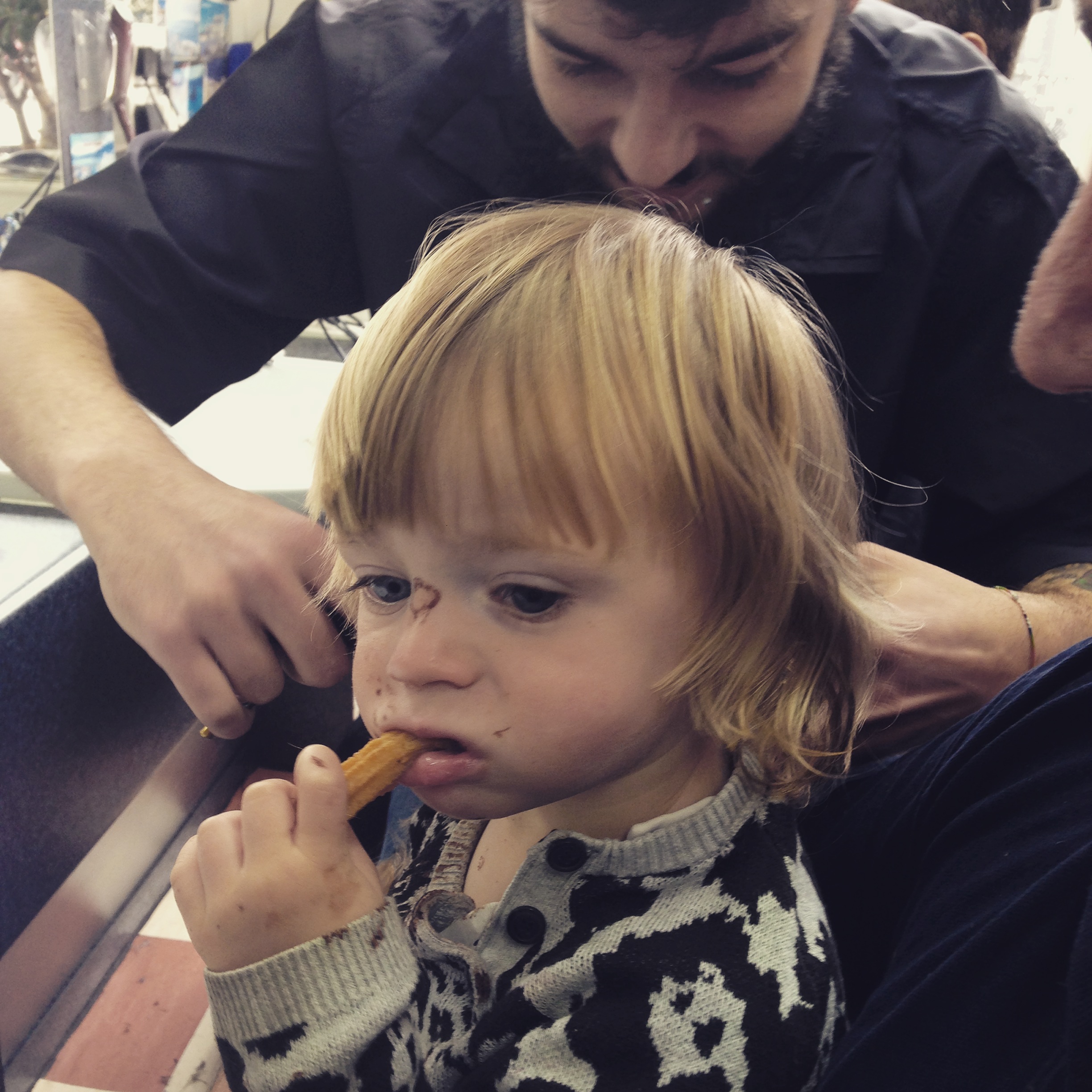 And here he is eating churros at the barber’s. Always something in that kid’s mouth, eh?