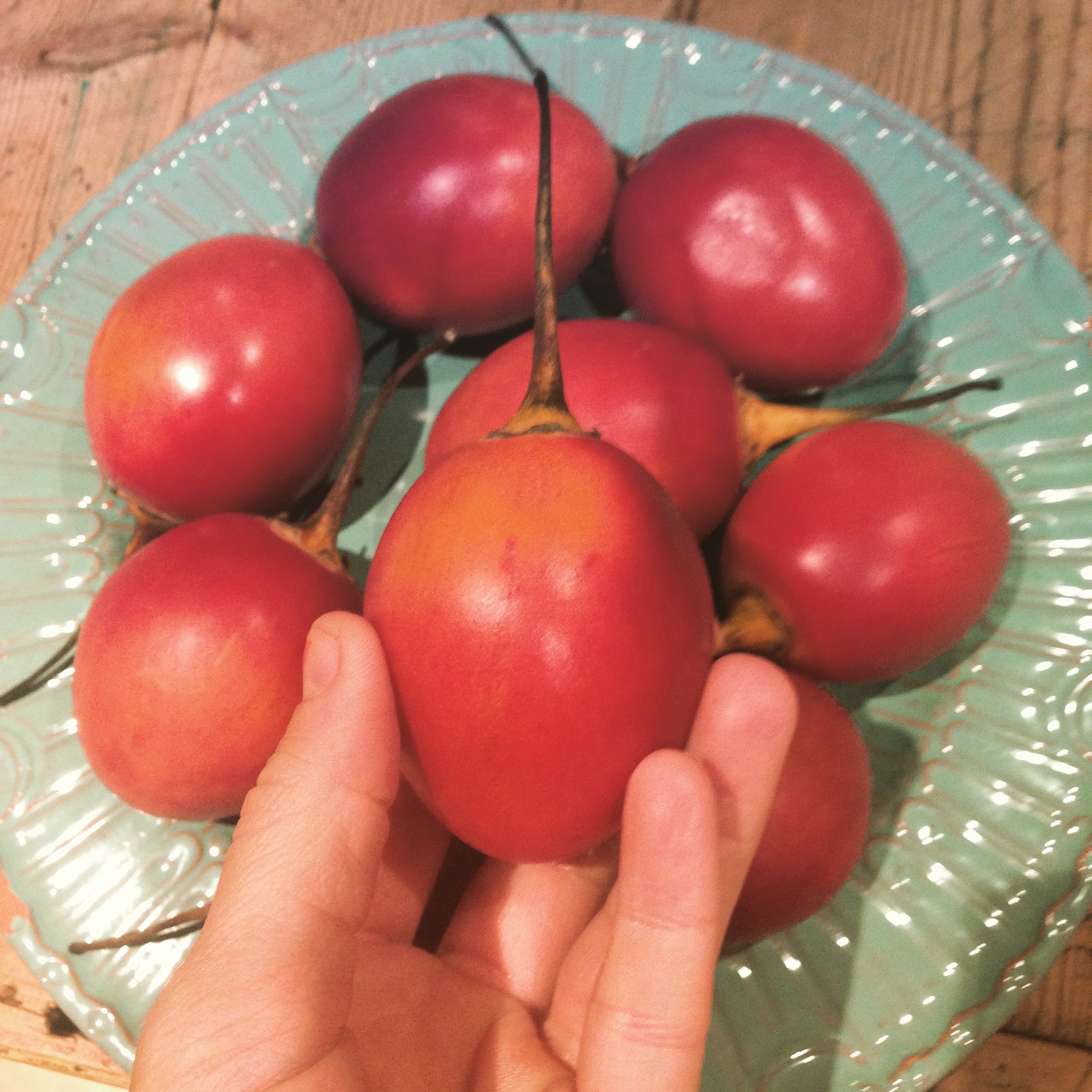 It’s been about 13 years since I wrapped my ageing lips around a massive bursting red fragrant tamarillo. When we first got them, we were misty-eyed and moved, and put them all together on a Portuguese teal plate for obvious colour-popping purposes, and then we put the plate into our room to keep the children away from them. We love our children and all that, but not enough to let them try a tamarillo. And our room! If you closed your eyes, you could imagine you were in some sort of photogenic New Zealand summer/beachhouse/orchard-type situation, because a plate of tamarillos on a chipped plate in a tiny basement bedroom (which is full of never-played guitars and bank statements in files dating from 2006 and massive haunted brown furniture and dirty balled up school socks sharing space under the bed with nests of hairy tumbleweed from the dog: and all those things have a fragrance of a kind, you know) gives out a delicate yet steady perfume of sweet tangy ripe tomatoey/passionfruity/melony goodness. And masks the dank horror for a moment.
