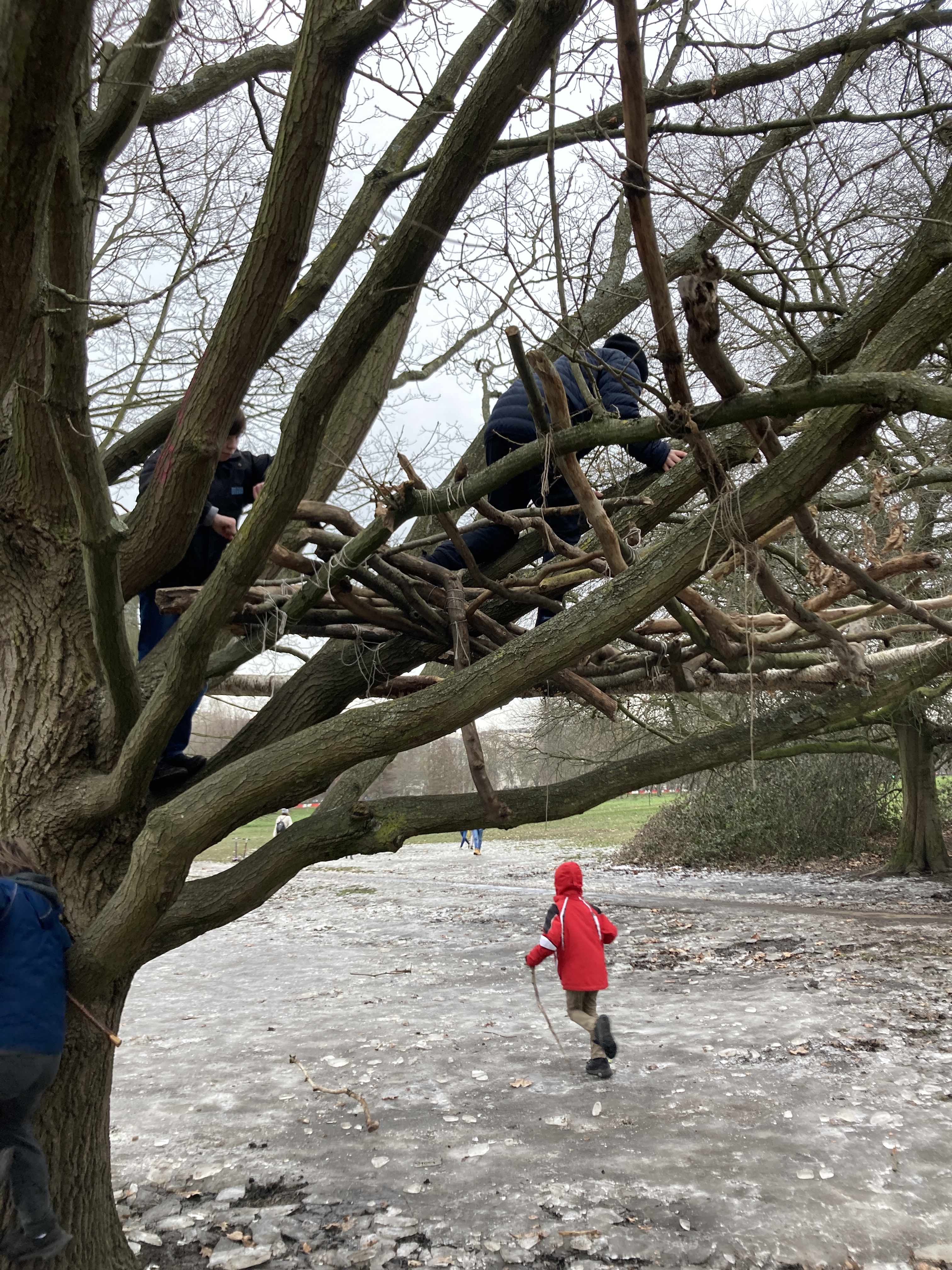 On a lighter note, here we are playing on a frozen pond in Hyde Park in half term. Climbing a tree, complete with obligatory stick: