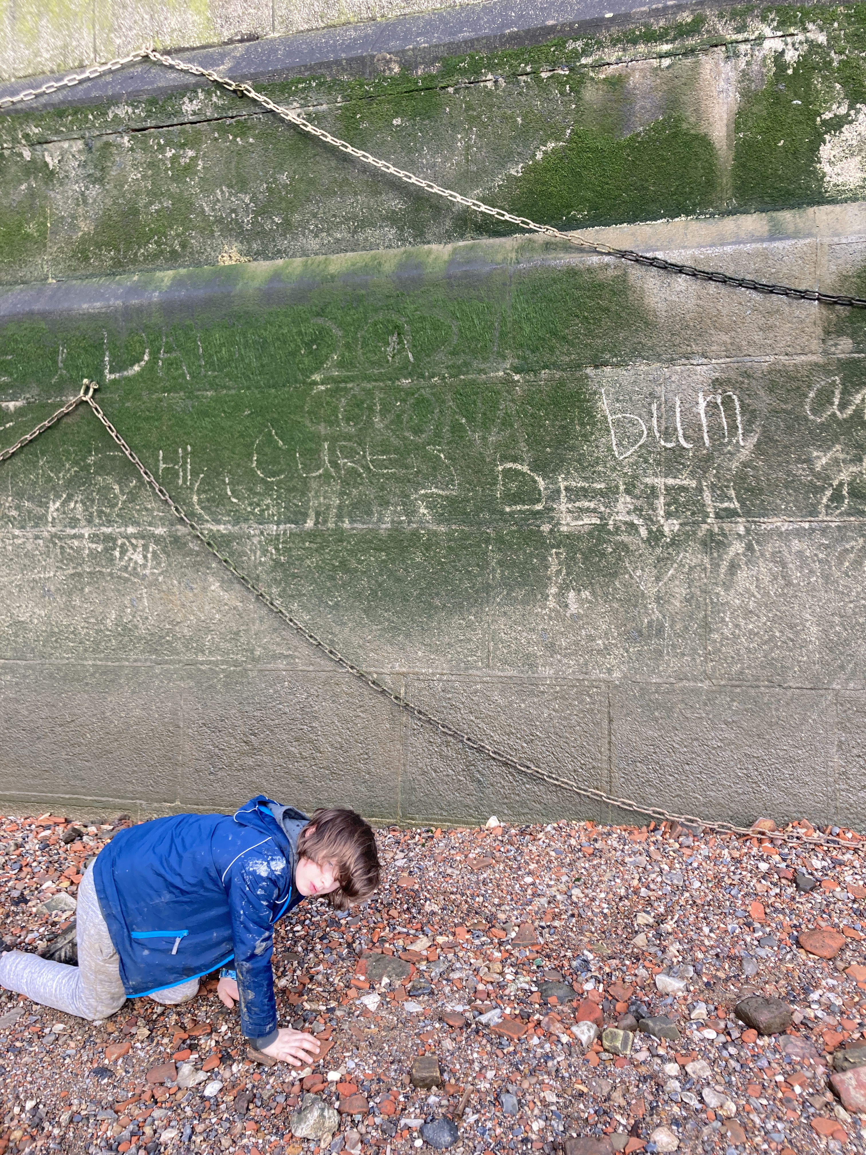 In the half term we went mudlarking and *maybe* wrote ‘bum’ on the algae-strewn rocks. There was a fair bit of sifting through the pebbles and we found 17th century pottery, a 1938 three pence coin and a rock which may have been a neolithic flint tool but may also have been a rock: