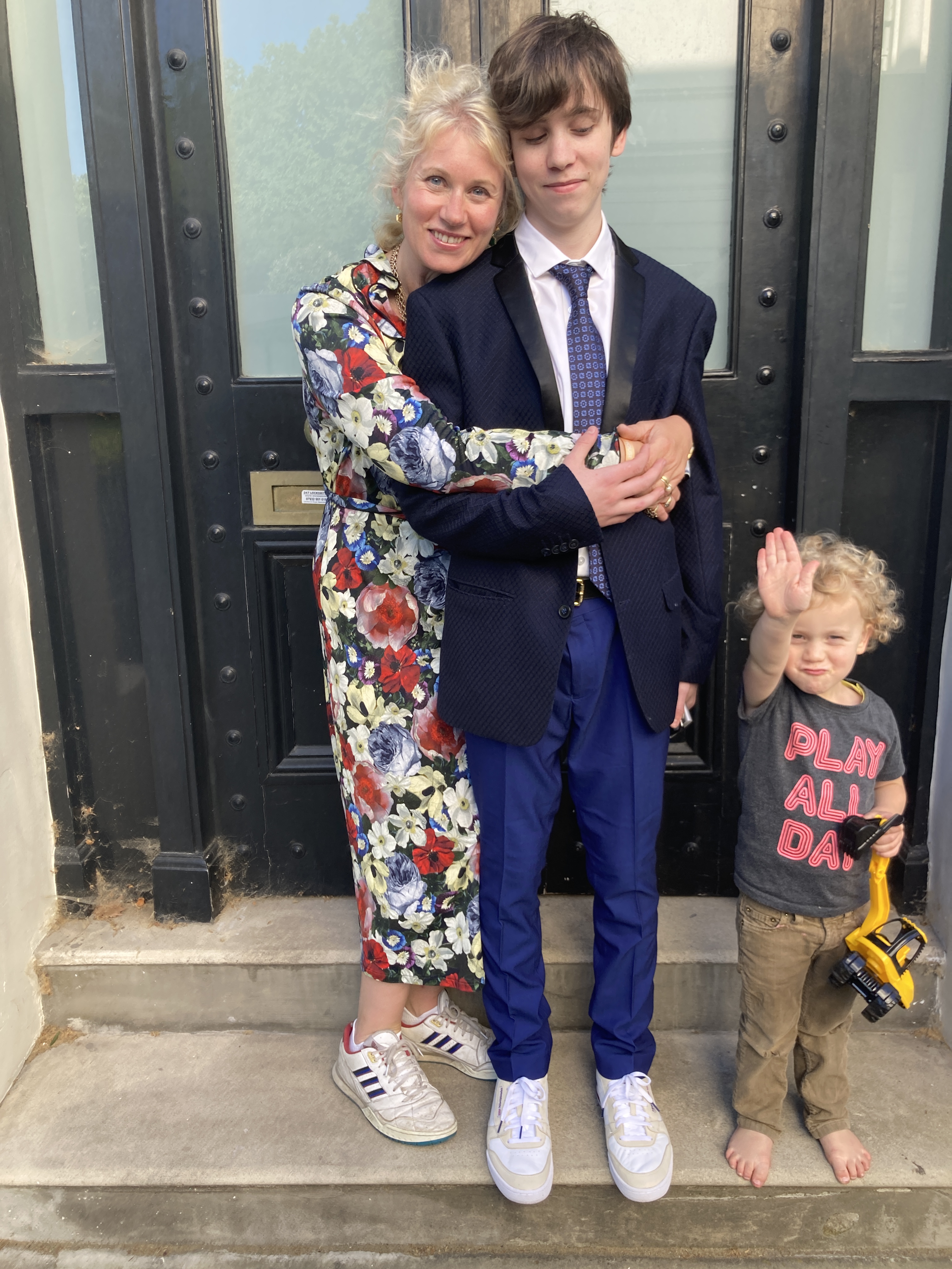 Here’s the divine, gentle, handsome Noah in his charity shop prom night ensemble with a needy clingy mother. Remi is making some kind of inappropriate salute: