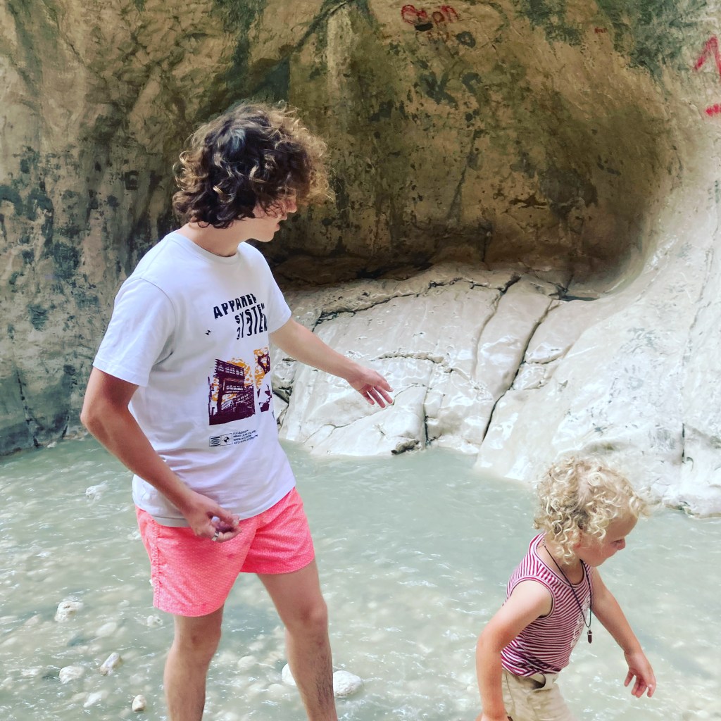 Youngest and oldest loving each other (actually wading through water and probably concentrating more on feet placement rather than familial love but bear with me):