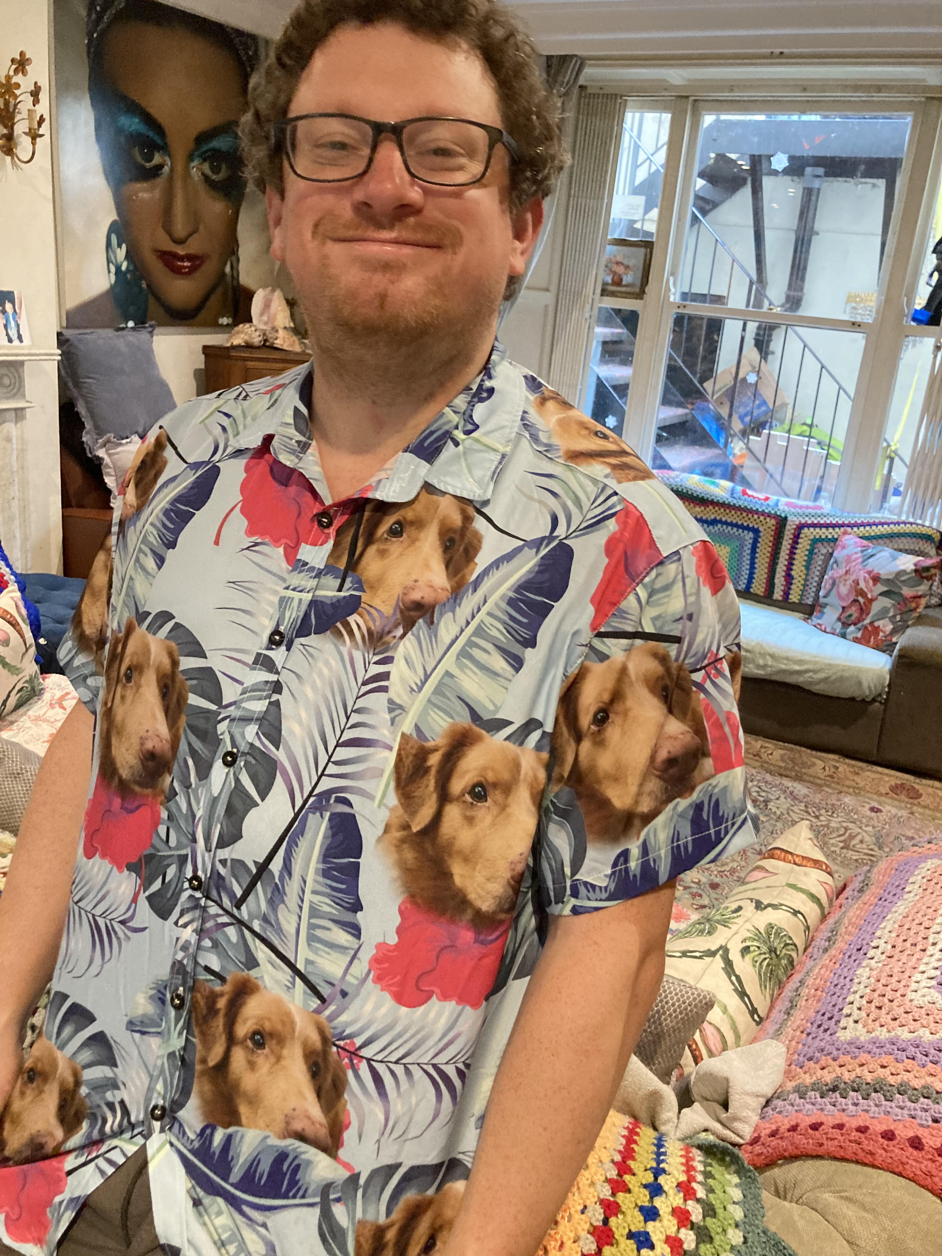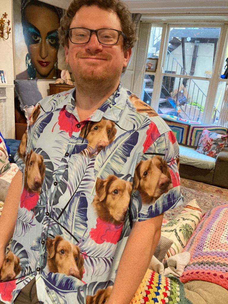 Lastly, but never leastly, here is Chris in a Christmas present shirt that features Magic the communal dog: