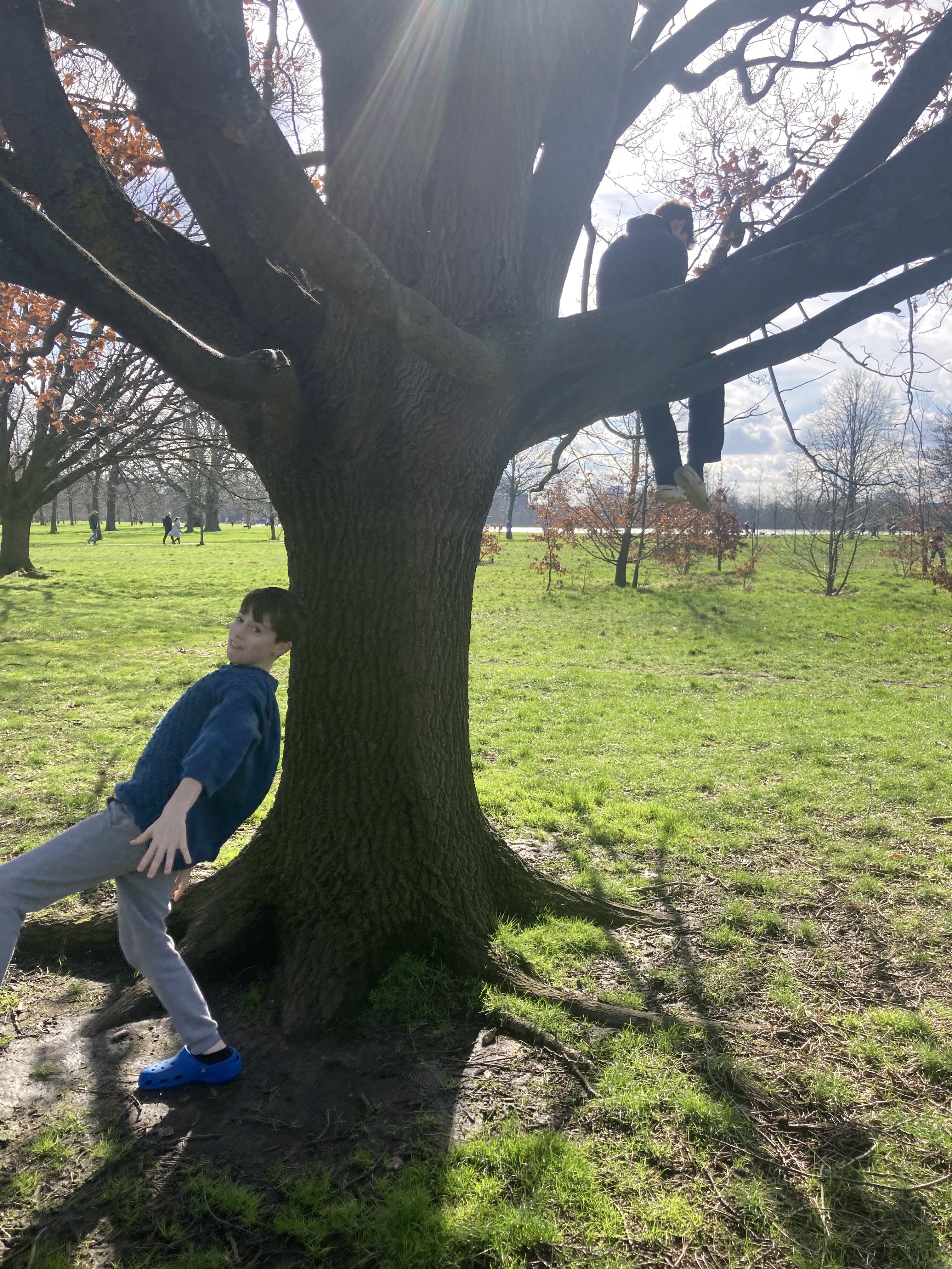 Today we did go and revisit the patch of climbing trees and lower bushes that I took them to every afternoon during lockdown. It’s hard to remember the afternoons we passed there during the one exercise break we were able to take, because it was boring and samey and stressful. We would bring the dog and he would make a huge fuss after a while, barking and trying to run away into the Serpentine, and we had people come and complain (from afar) telling me that my dog was disturbing their precious quiet time. He very much was, but there was just me and six children (one a baby) and no where else to go and he was disturbing my peace too, as I recall. I was doing my best.