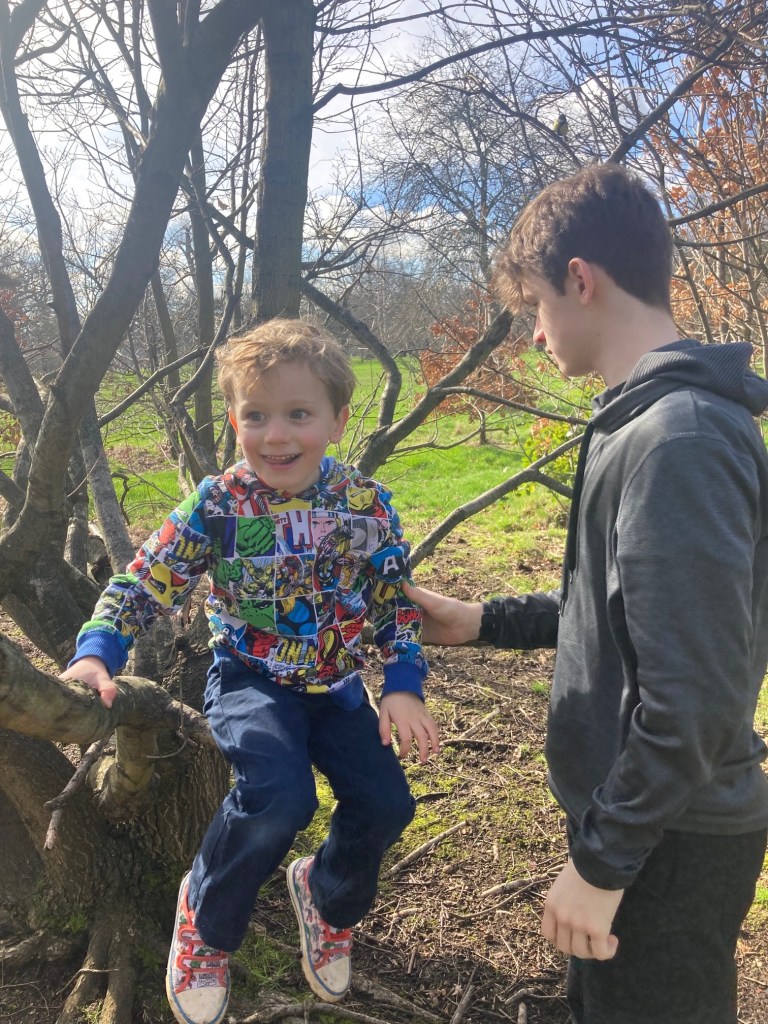 On strong sons, the kids can now pretty much heave themselves up into the trees using their extremely impressive upper arms. Ned said he would like to become a BBC gladiator eventually and his name would be ‘Dorito’ because he loves Doritos and his musculature is currently triangle-shaped. I think that’s a marvellous goal.